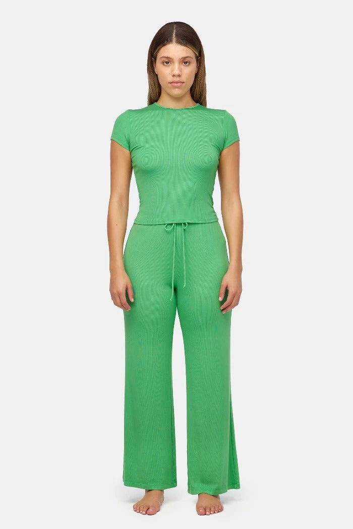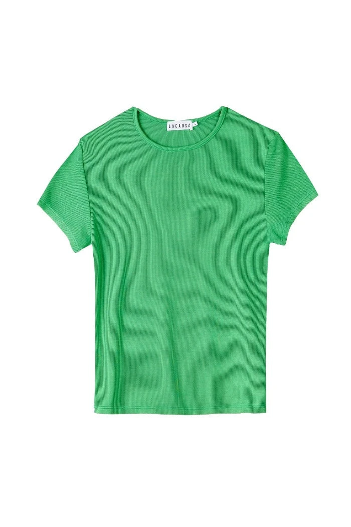 Lacausa Quincy ribbed baby tee in green apple. A fitted baby tee made from luxe 2×1 rib with a touch of spandex to for a snug, supportive fit! Siro spun micro modal is a semi-synthetic, plant-based fiber that is silky smooth to the touch.