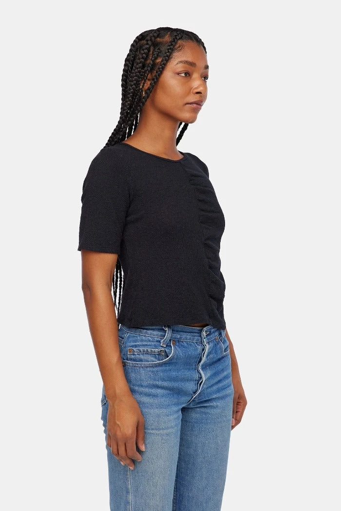 Lacausa Ruched tee in textured black. A basic with a twist. Fitted through the body with a ruching at center front seam.