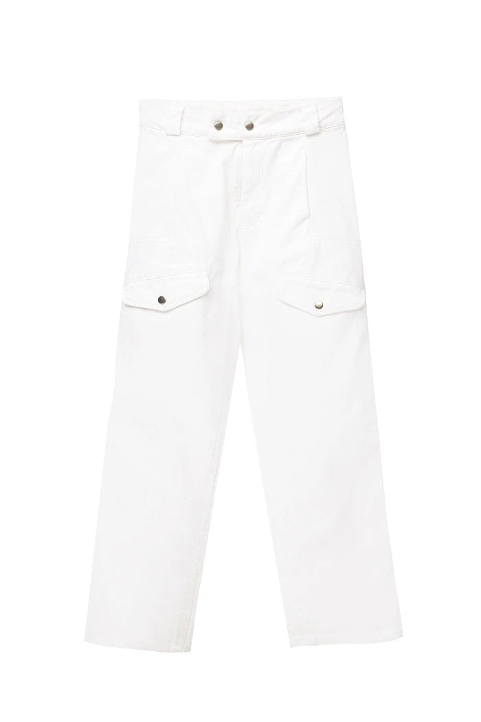 Lacausa Diego cargo trousers in parchment white. Vintage menswear inspired four pocket work pants with seam details on front and back, zipper fly with snap closure. High rise with a straight, slightly tapered leg for a flattering, feminine fit. Made from garment dyed bull denim.