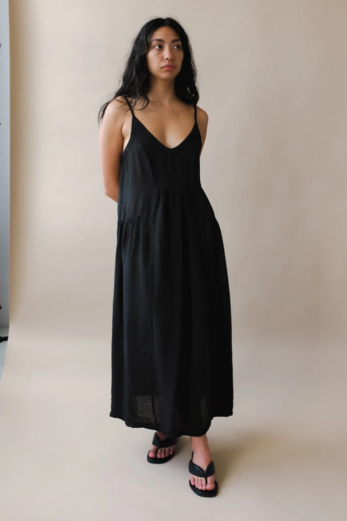 Lacausa Thea slip dress in black. A timeless slip dress with v neckline, adjustable straps, paneled details and feminine shirring for a bit of subtle volume. Made from lightweight, textured parachute fabric.