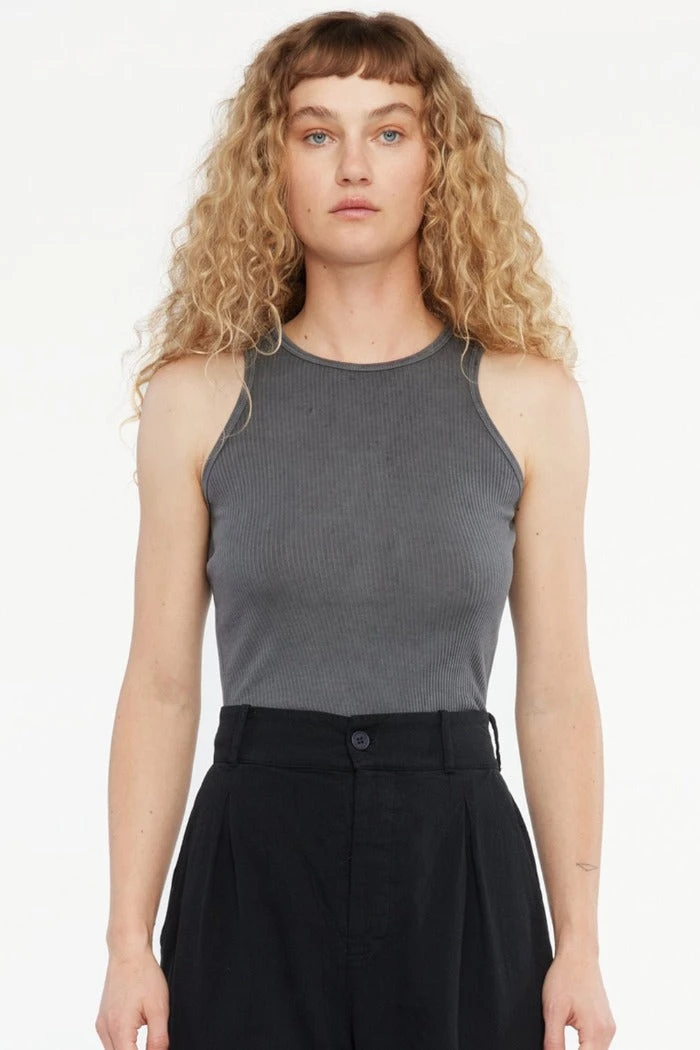 Lacausa Zoe tank in slate grey is made from the best selling cotton rib with a high, narrow neckline and fitted body. Inspired by the perfect vintage undershirt.Â