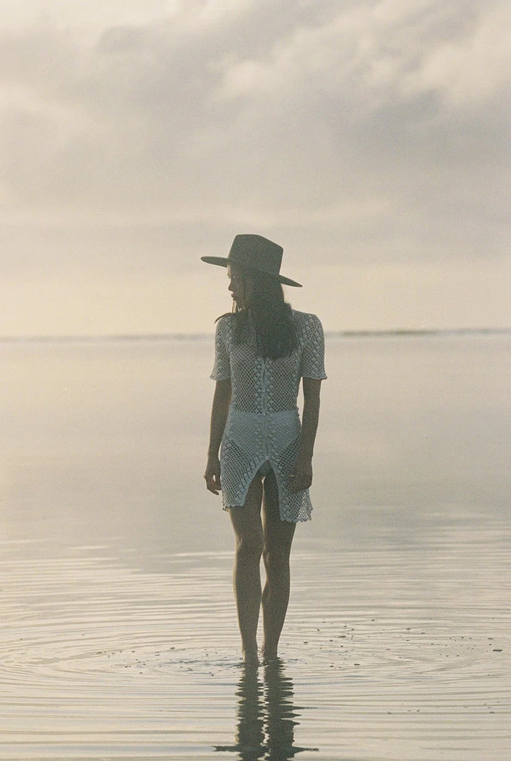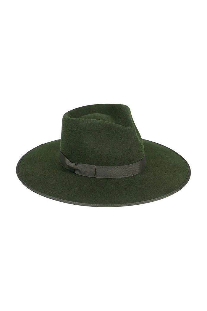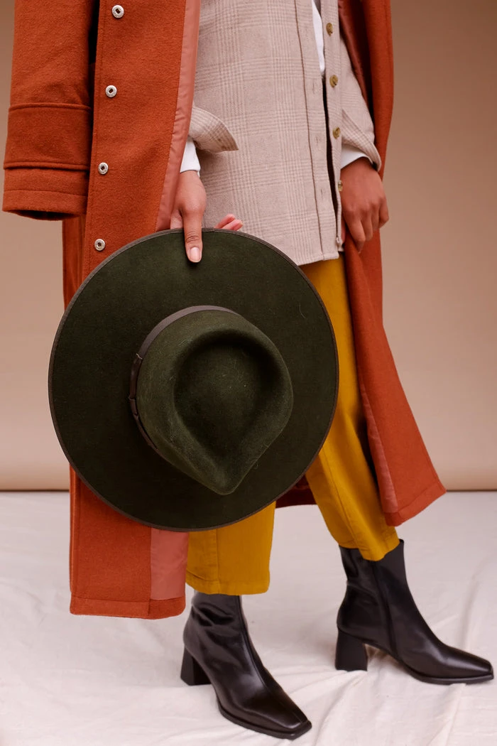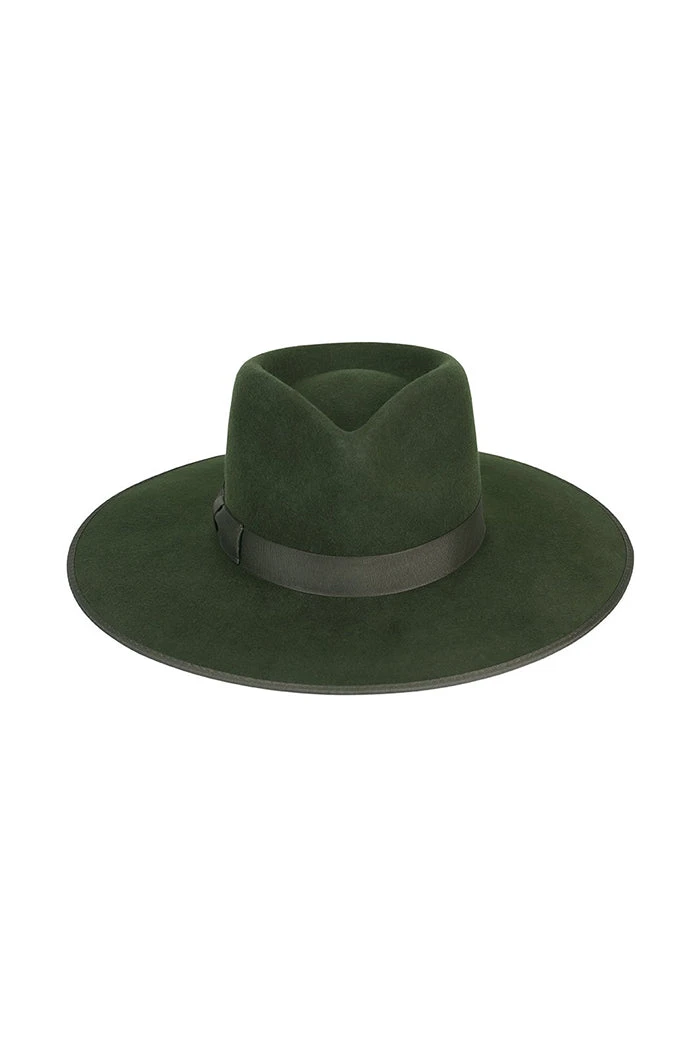 Lack of Color Forest Rancher green hat. Inspired by vintage men’s styles, this hat is designed to make a statement. A stiffened wool fedora with rigid crown design. Trimmed on hat and rim with tonal gross grain ribbon.