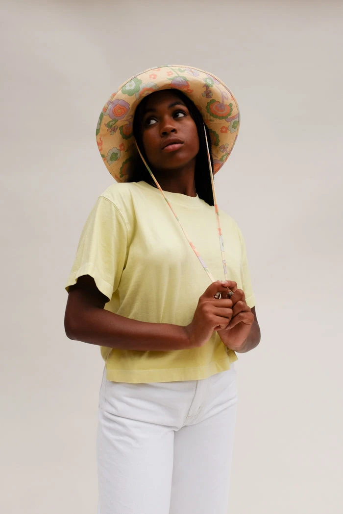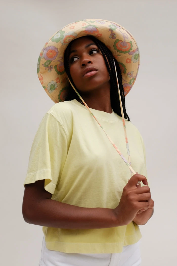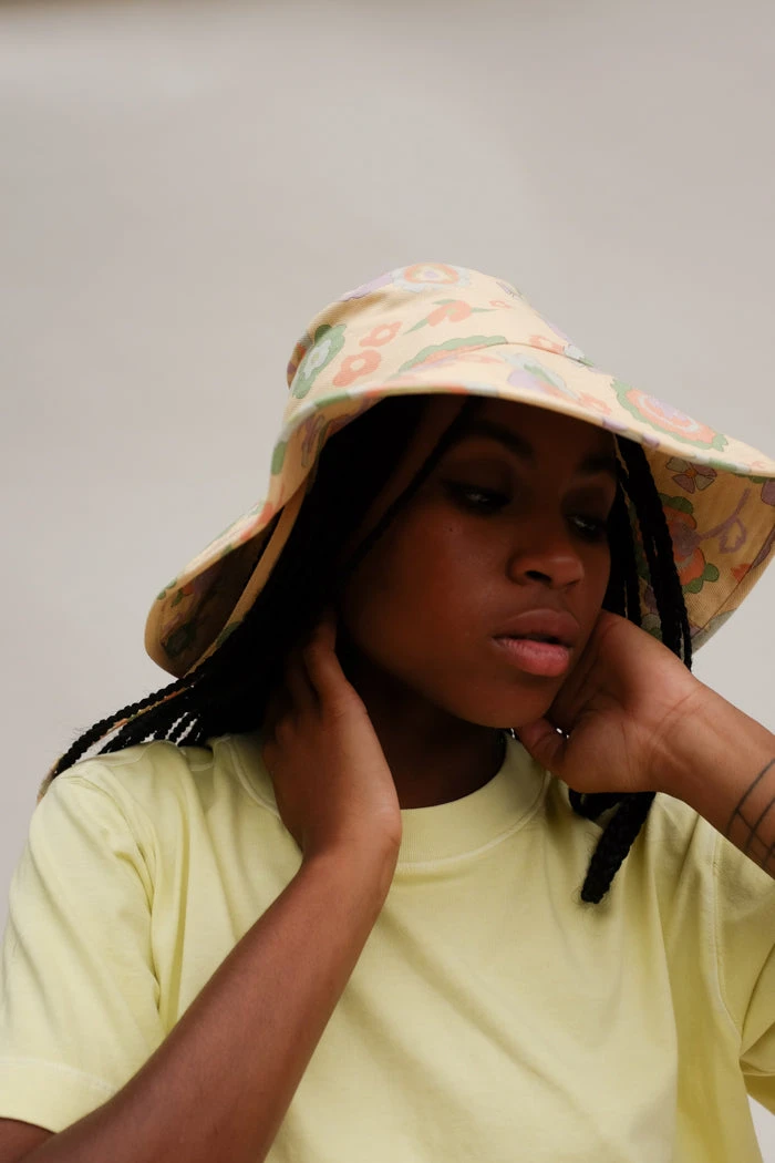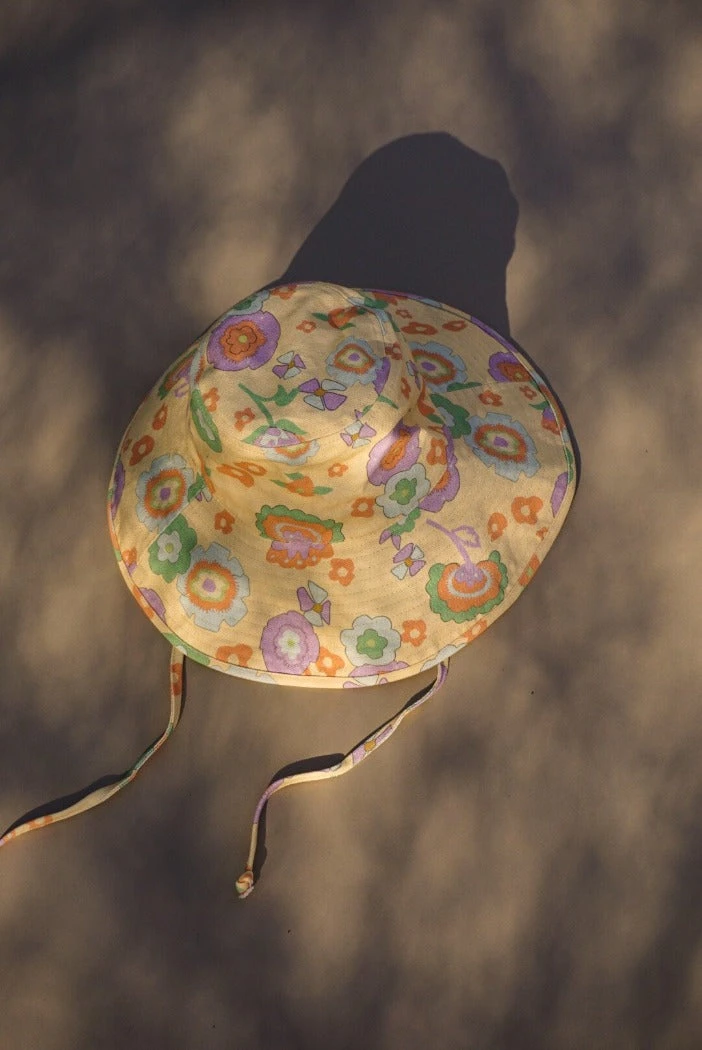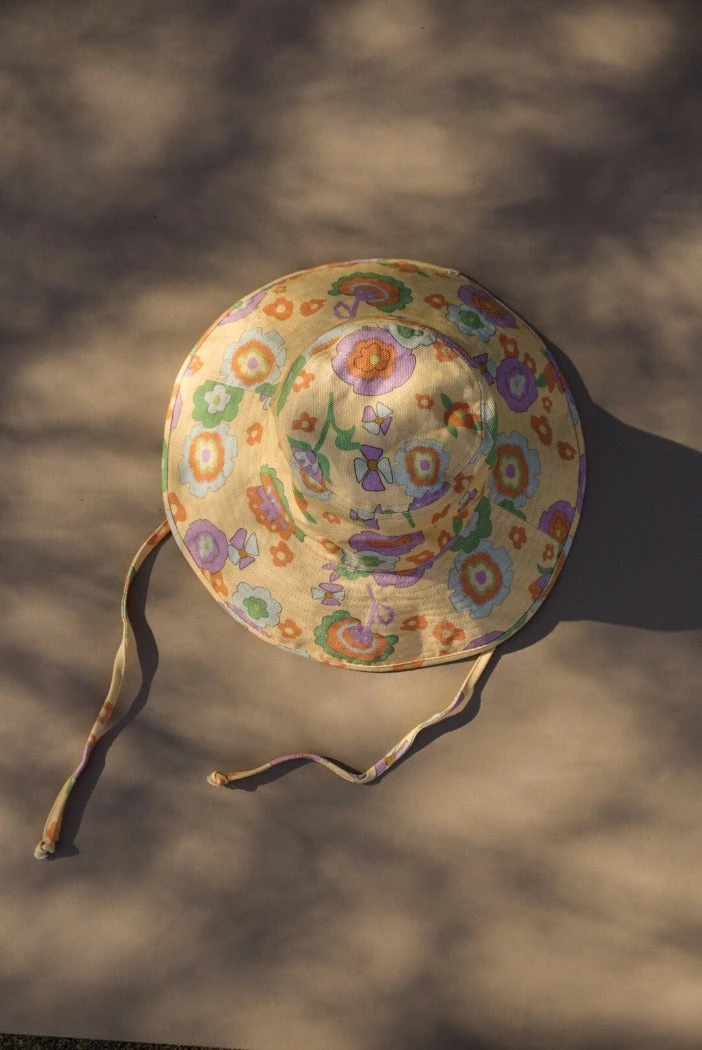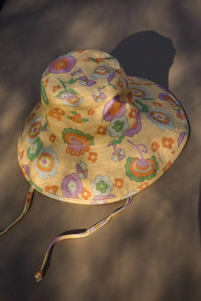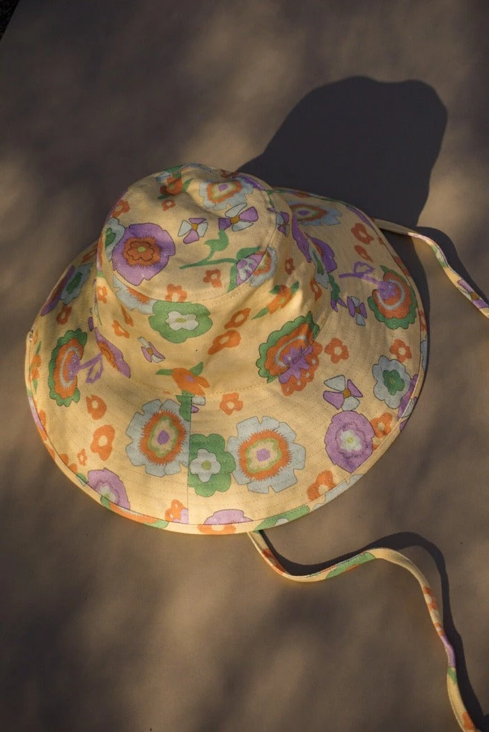 Lack of Color Holiday wide brimmed canvas bucket hat in retro floral print. Finished with a neck tie to secure the hat to your head on all the adventures your day may bring you.