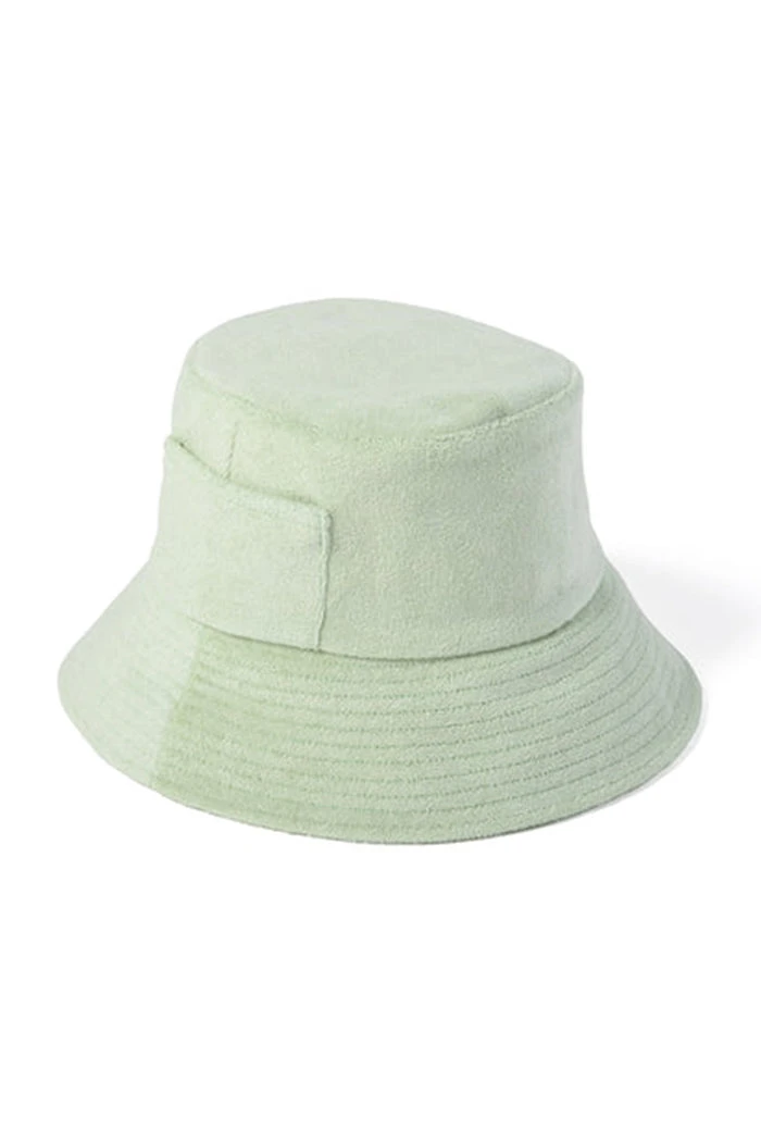 Lack of Color Wave bucket hat in mint green terrycloth. Cool and simple bucket hat. Throw on this easy to wear style for a sun-safe, street look.