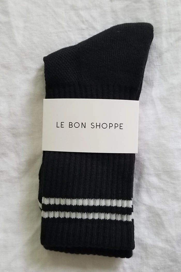 Le Bon Shoppe Boyfriend socks in black noir. Stay fly all year long in these calf length sports socks. Pair with sneakers or sliders. Perfect for work from home.