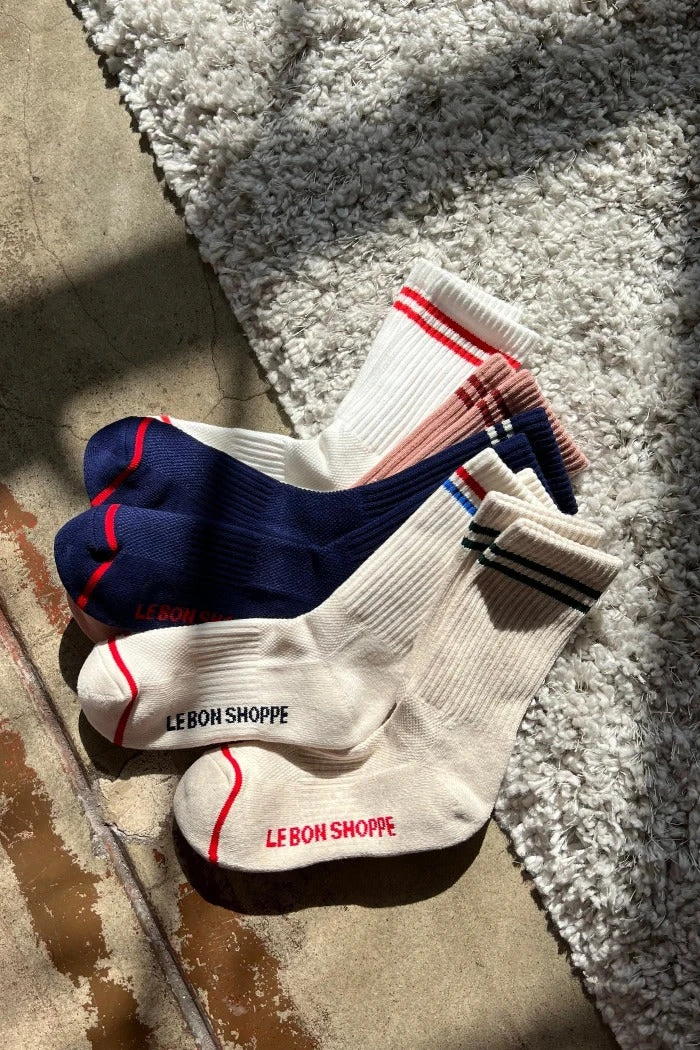 Le Bon Shoppe Boyfriend socks in oatmeal. Stay fly all year long in these calf length sports socks. Pair with sneakers or sliders. Perfect for work from home.