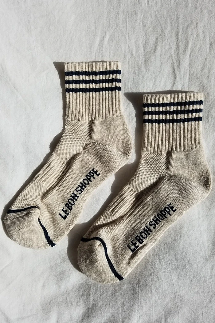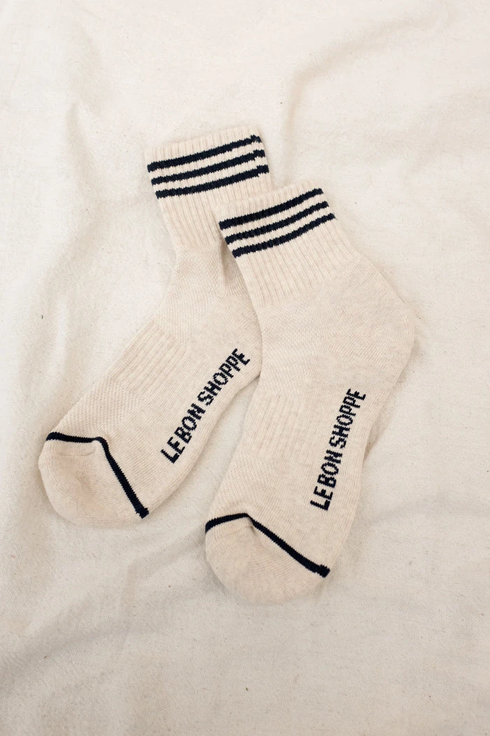 Le Bon Shoppe Girlfriend socks in oatmeal with three navy stripes. Crew version of one of our bestselling Boyfriend Socks!