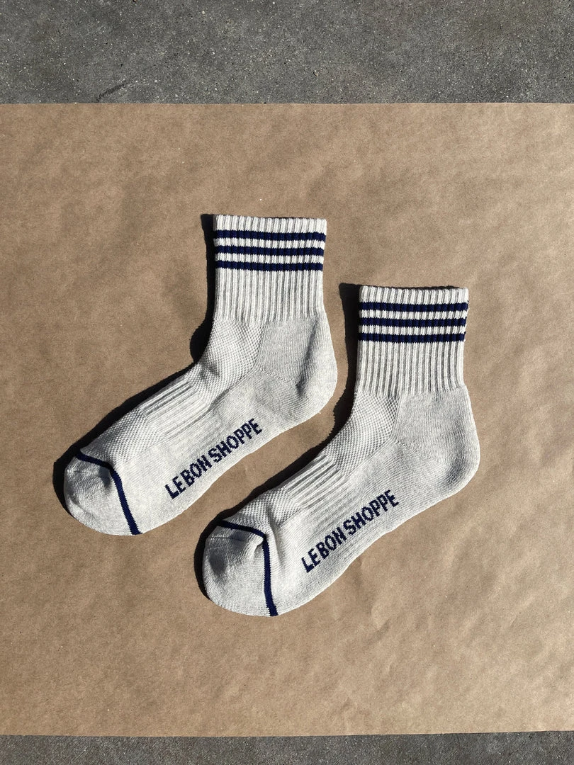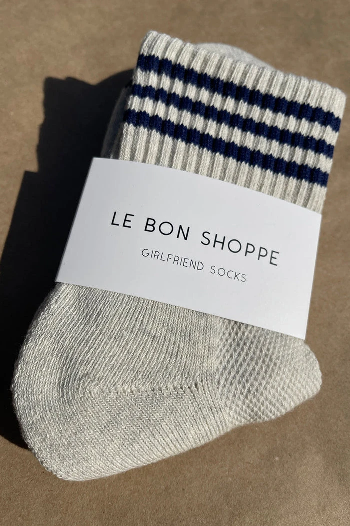 Le Bon Shoppe Girlfriend socks in sailor grey and navy stripe. Crew version of one of our bestselling Boyfriend Socks!