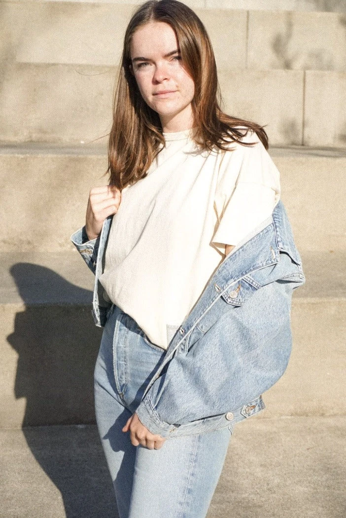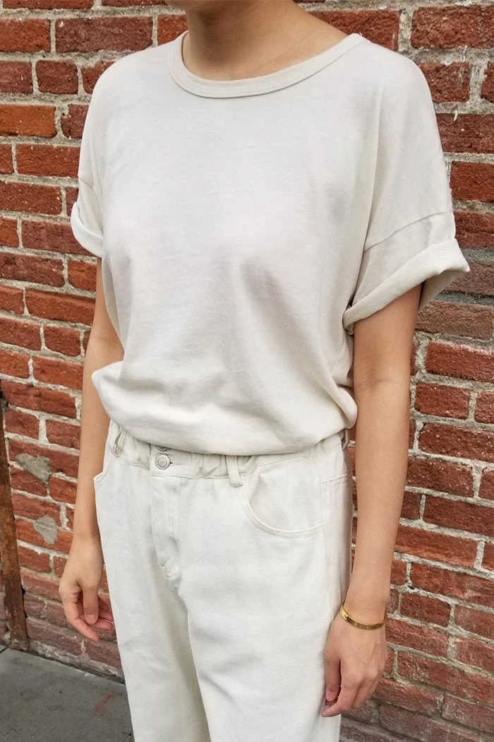 Le Bon Shoppe Her tee bone. A perfect round neck with a ribbed band finish, just the right amount of dropped shoulder, sleeves that can be rolled up, a shirttail hem to tuck in, tuck out or tie at the waist. Crafted from the softest local 100% cotton low gauge knit. Garment washed and dyed each tee for a beautiful natural worn-in look.