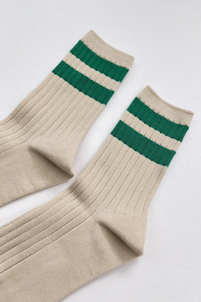 Le Bon Shoppe her varsity socks in cream with green stripes. Bold stripe edition of her socks in mercerized combed cotton. The perfect height, knit rib socks.