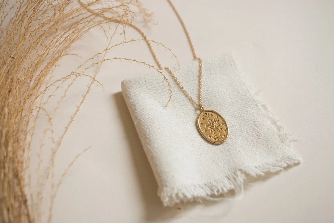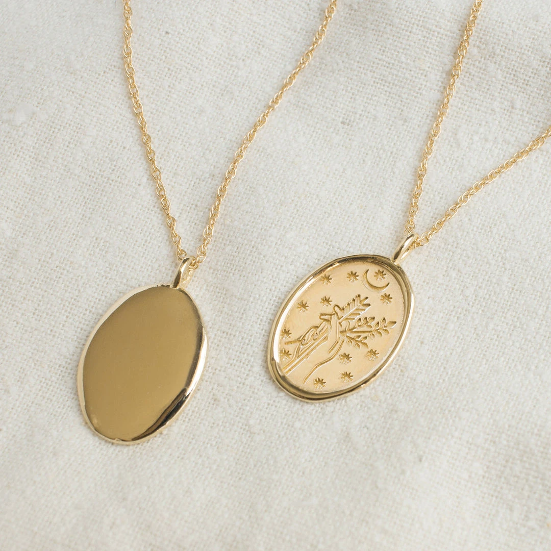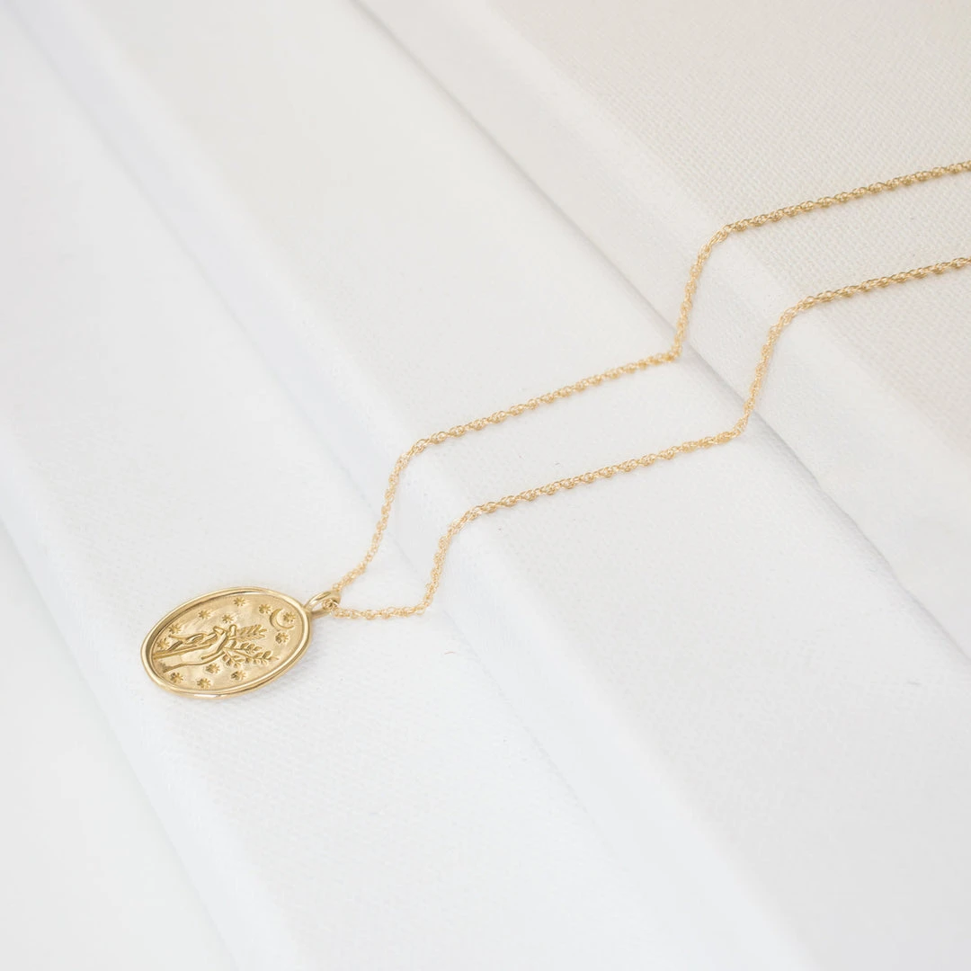 Merewif Diana gold engraved necklace. The artwork is based on roman goddess Diana, who was a roman goddess of the hunt & the moon, and had the power to talk to animals.