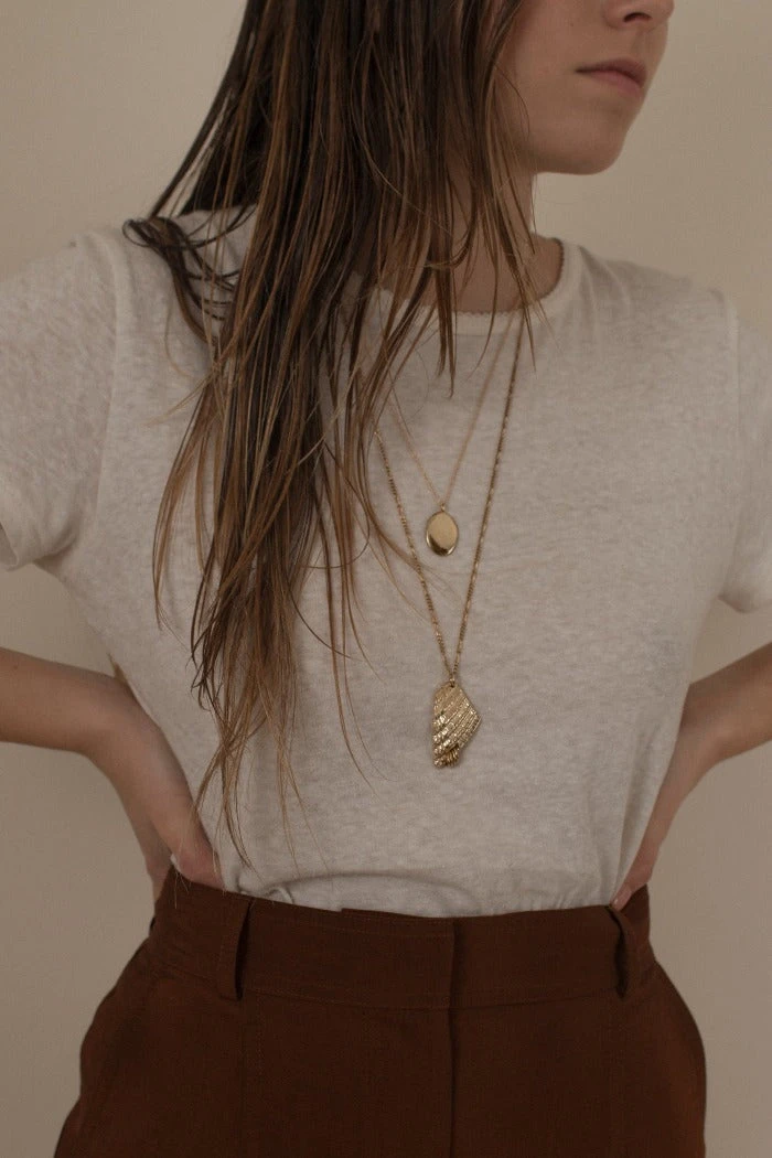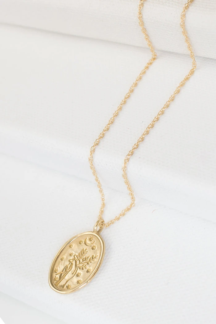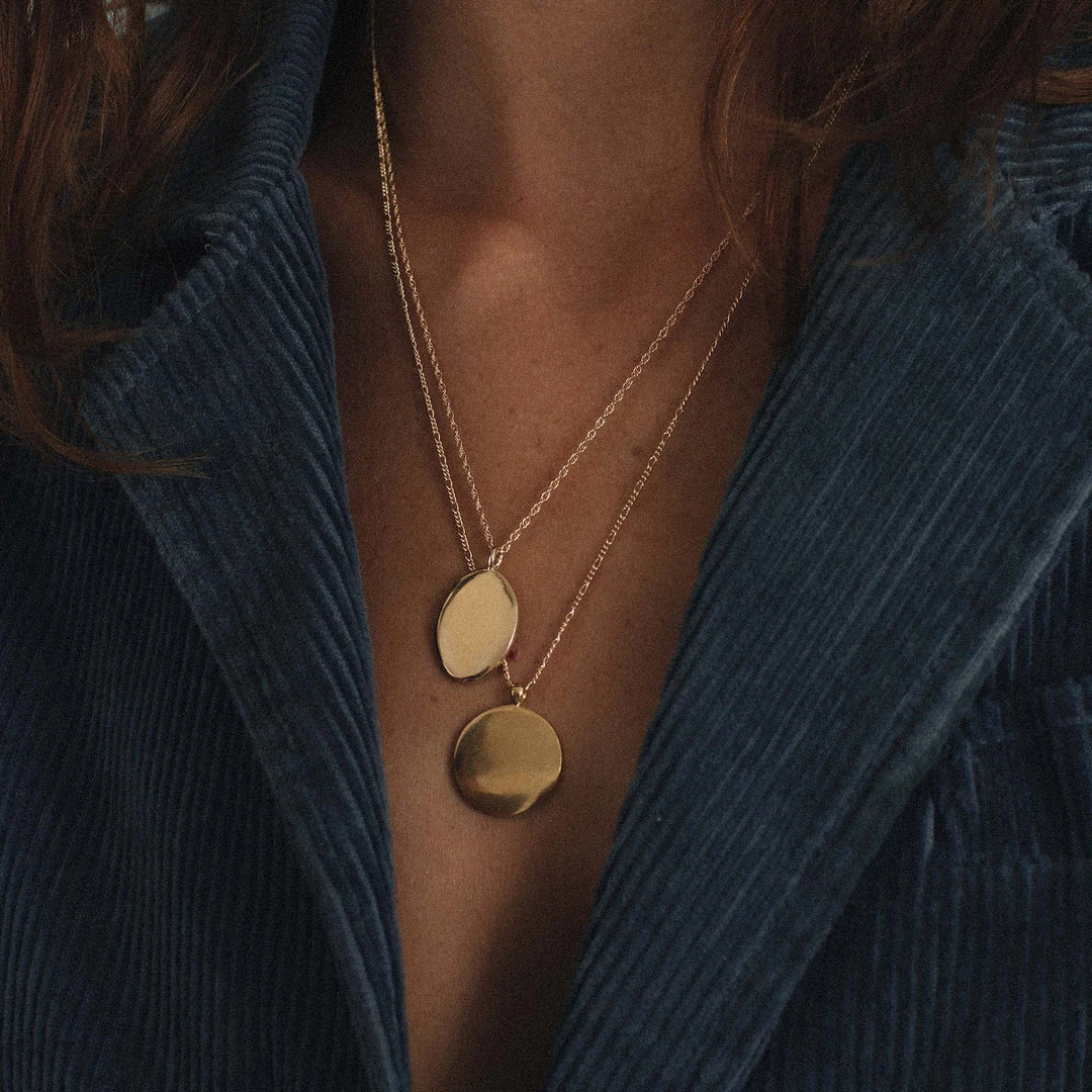 20” gold filled chain, 16mm x 22mm gold plated brass pendant.
