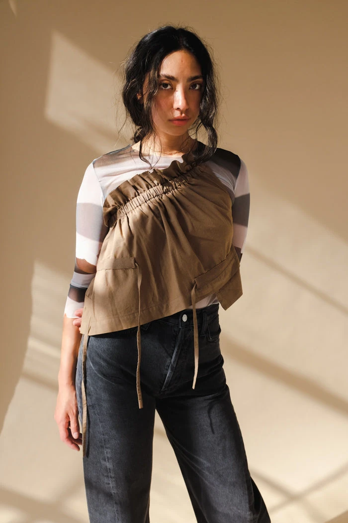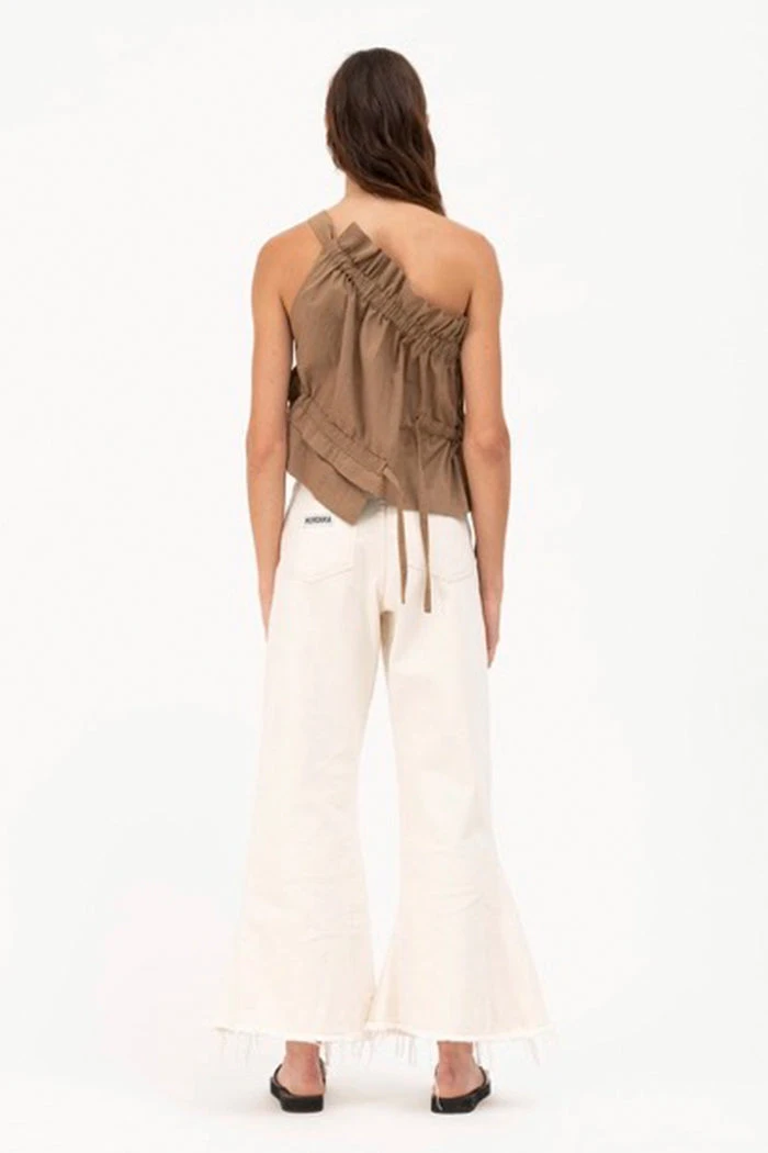 Mundaka Ruffle one shoulder top in taupe brown. Adjustable ties, to sinch the top in or make it more flowy.Â