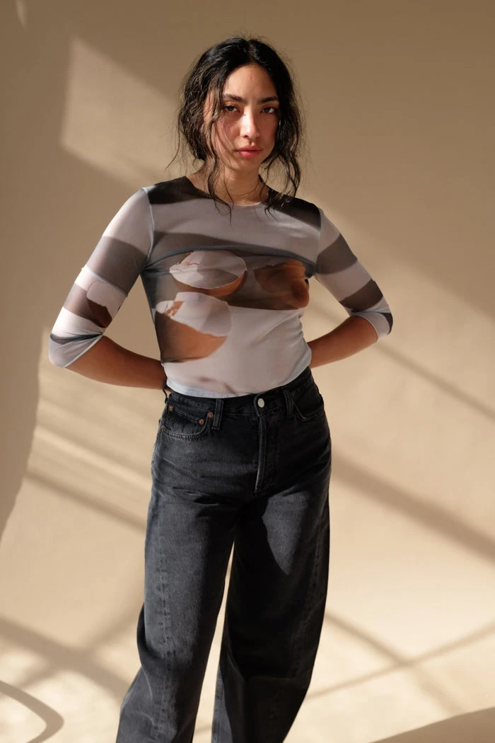 Mundaka Tulle egg print long sleeve mesh printed top. Printed with analogue 35mm photograph taken at home. Raw edges tulle t-shirt, elastic and soft to the touch.