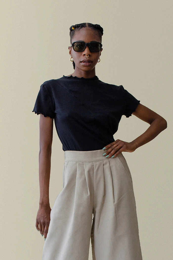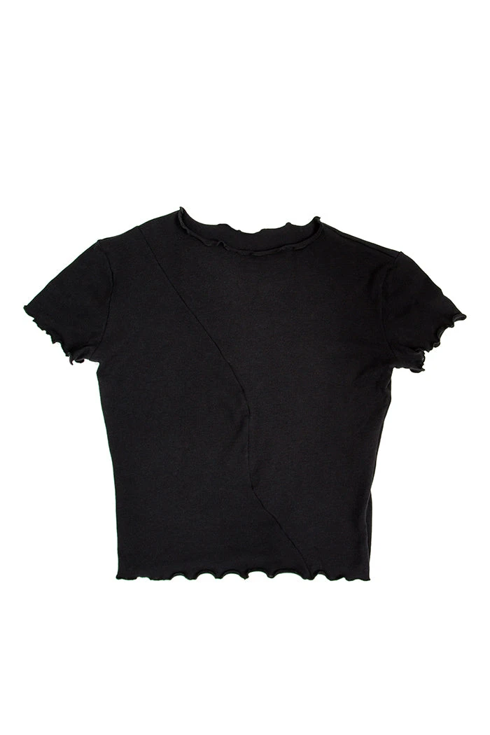 Nin Studio cotton swirl tee in solid black with seam detail diagonal across body. Inspired by the unconscious and conscious in constant communication. This shirt is short sleeve and can be layered or worn on its own. Lettuce hem.