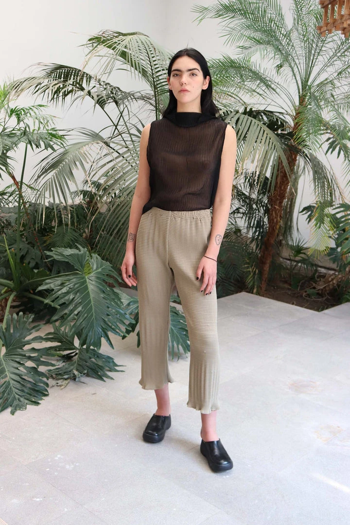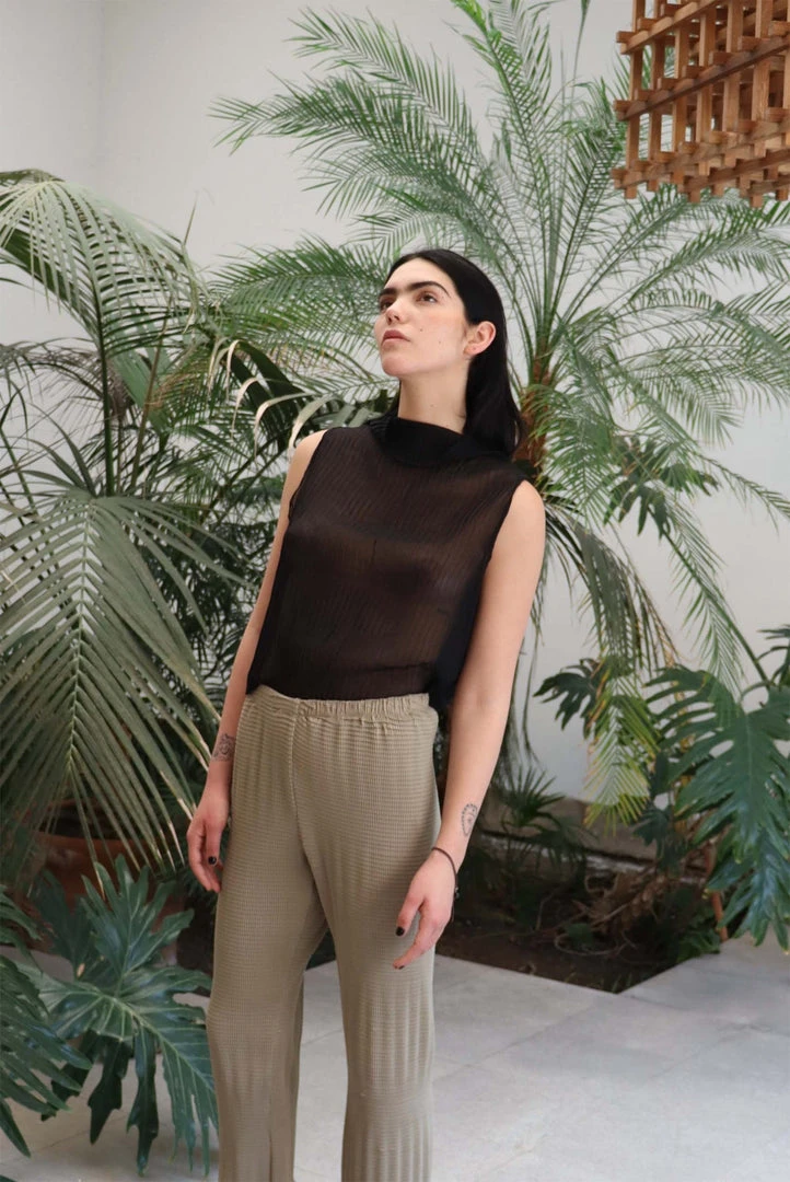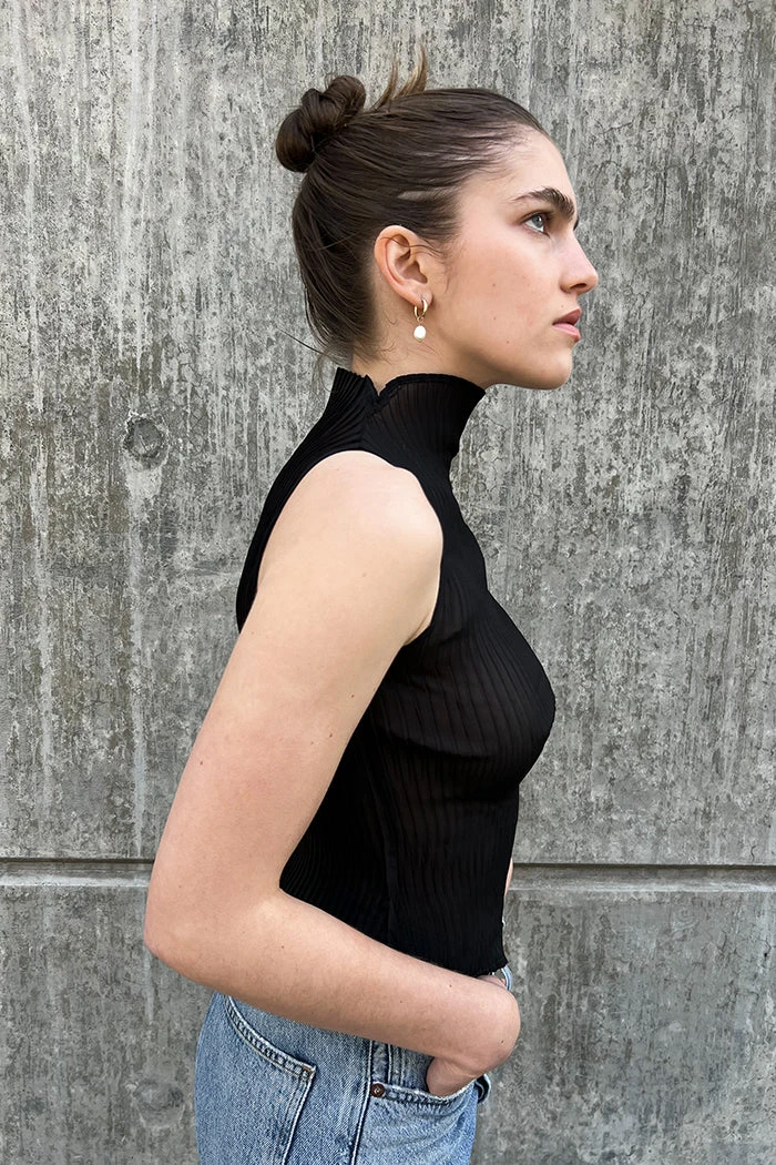 Nin Studios sheer wave mockneck tank featuring a pleat style in a 1 cm wave design. A timeless piece for everyday use.