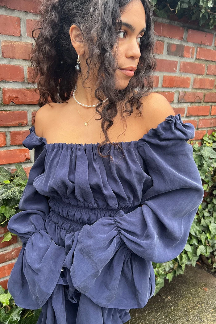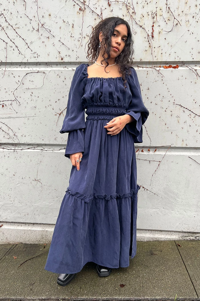Ohsevendays Willa vegan silk midi peasant dress with elasticated waist, square neckline and peasant sleeve. Features side pockets and flowy ruffle cuff.