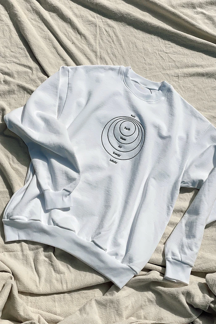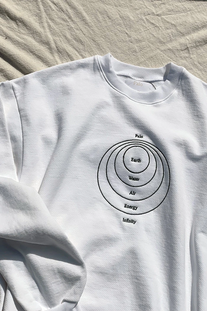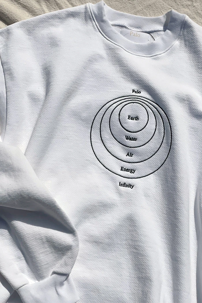 Palo Santo Studio Energetics Sweatshirt in white with dark green embroidery. Oversized classic crewneck in a vintage-inspired garment wash.