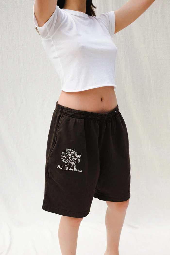 Palo Santo Studios peace people embroidered short in espresso brown. His & Her unisex shorts. These light-weight cotton shorts will wear in beautifully with age. They will expand and contract as you wear and wash, and there is an adjustable drawstring to tighten and loosen the waist.