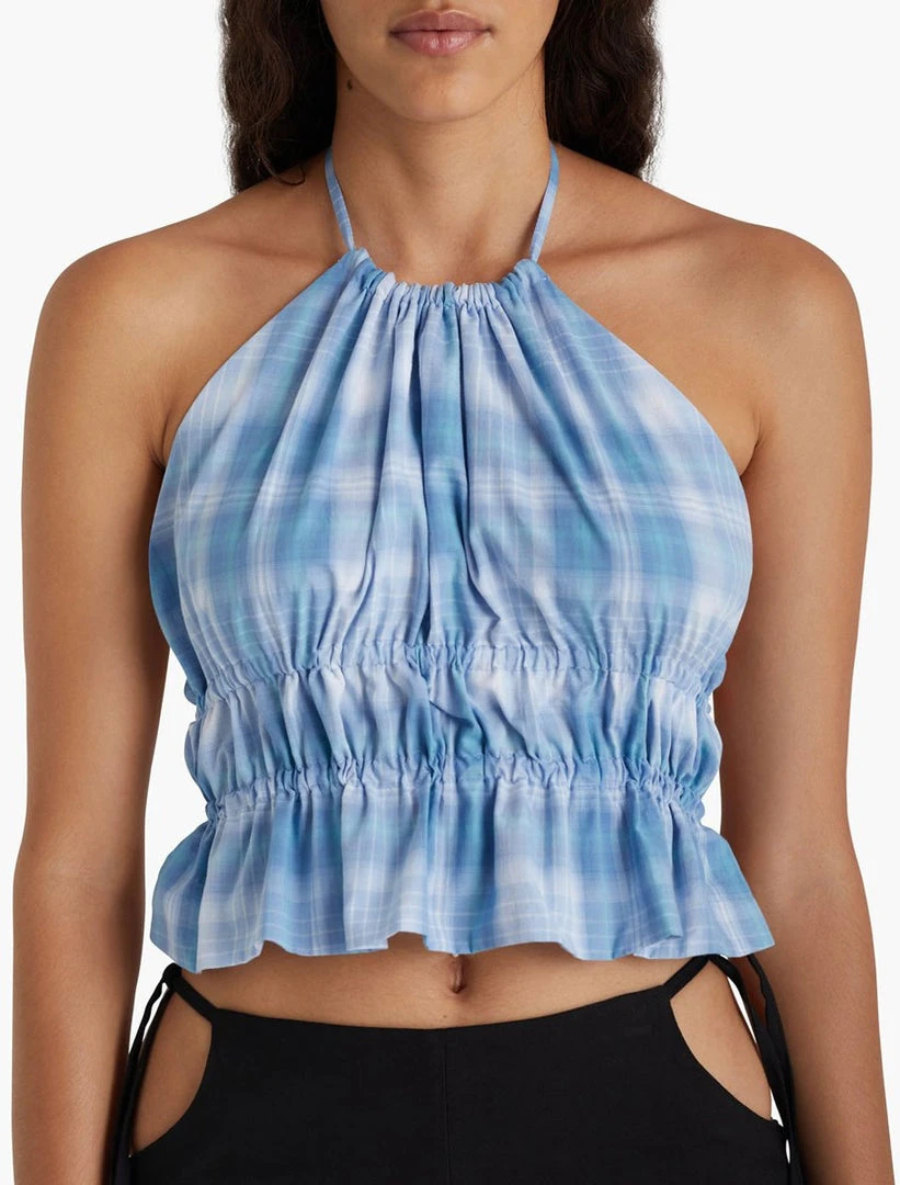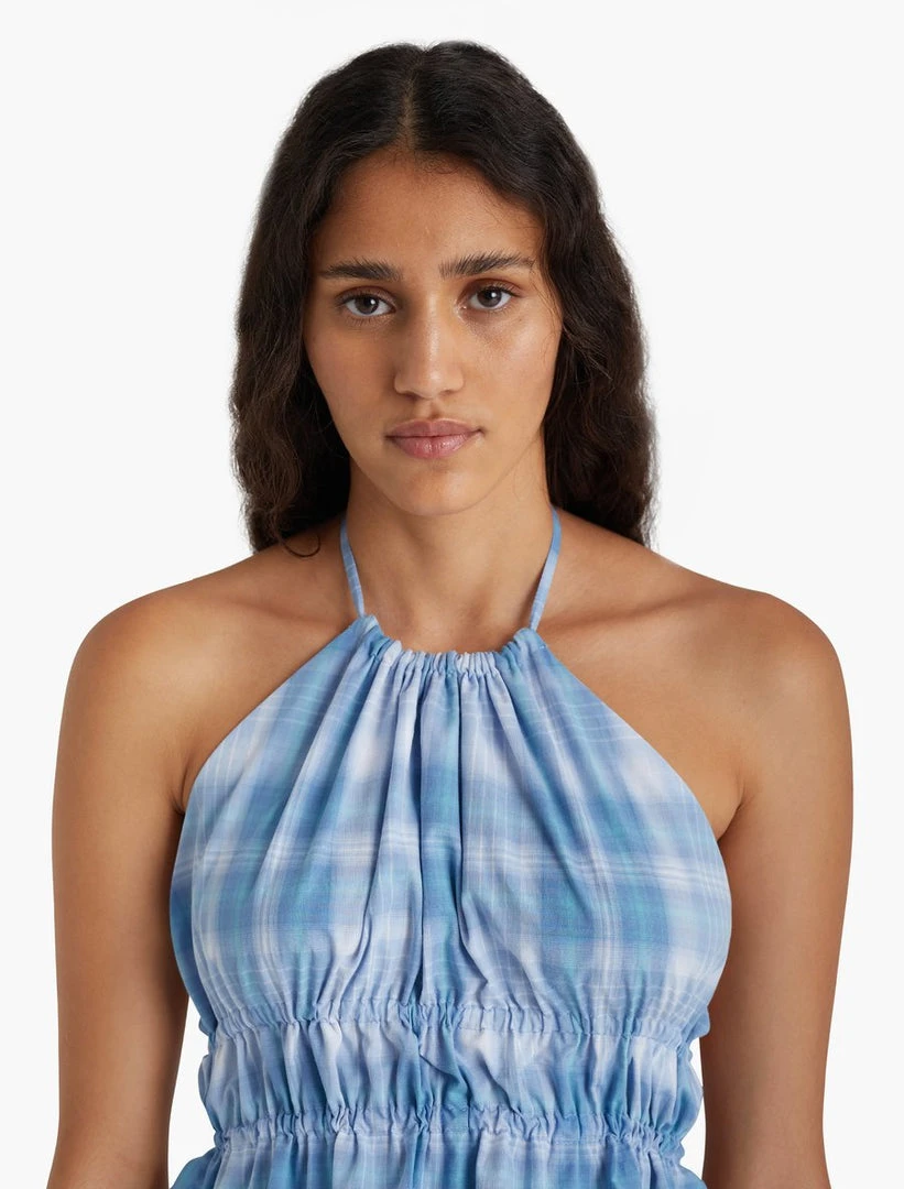 Paloma Wool Anouk halter top in blue plaid. Lightweight organic cotton top with adjustable strings around chest and neck.