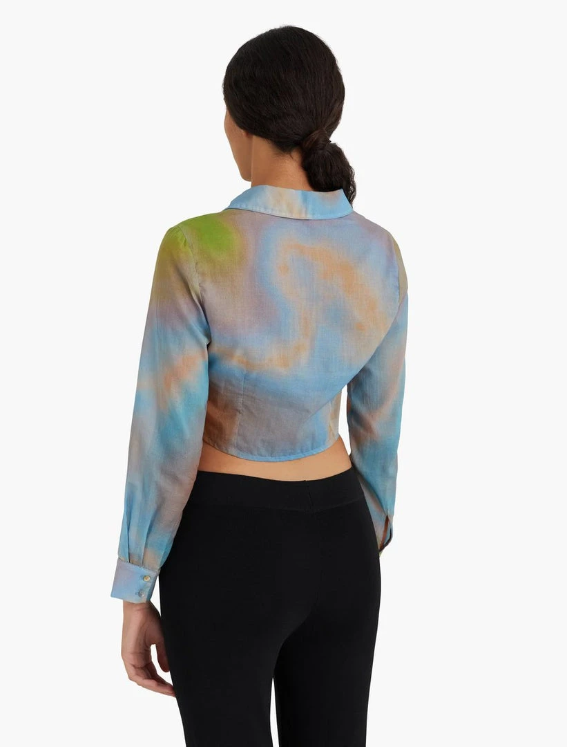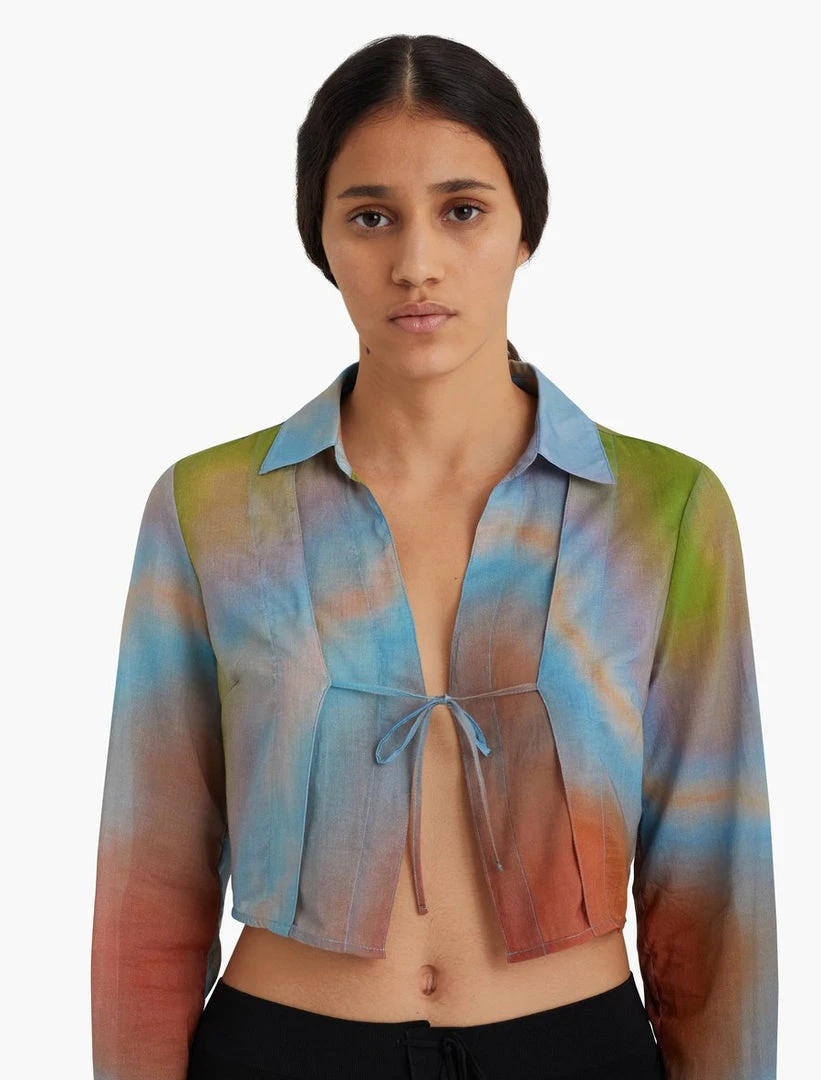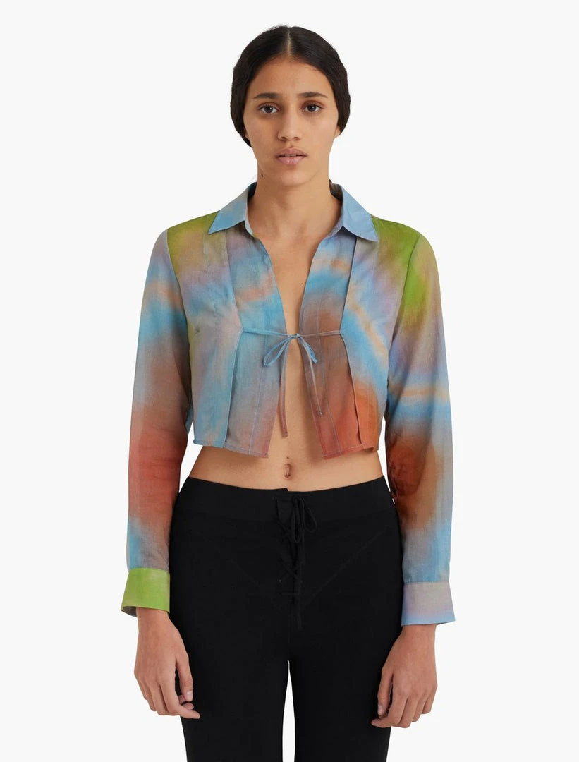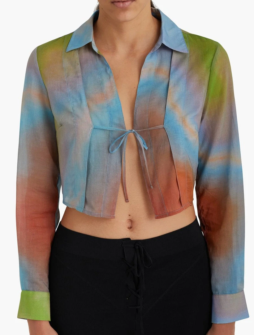 Paloma Wool collared Carolee long sleeve colorful print with front lacing. Print by Nika Milano.