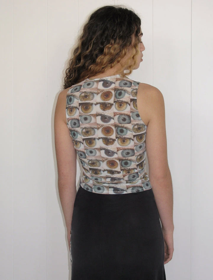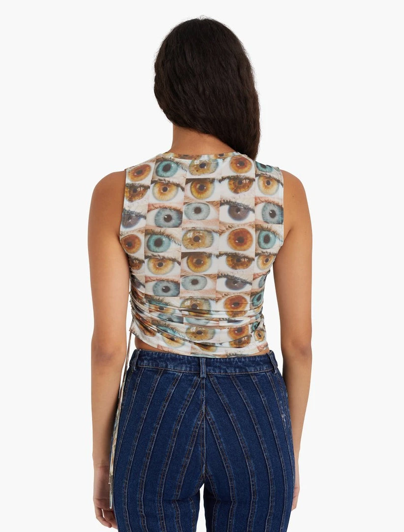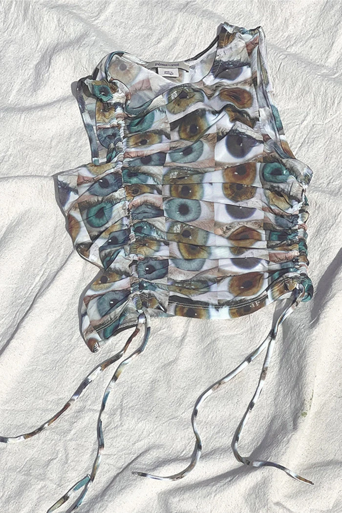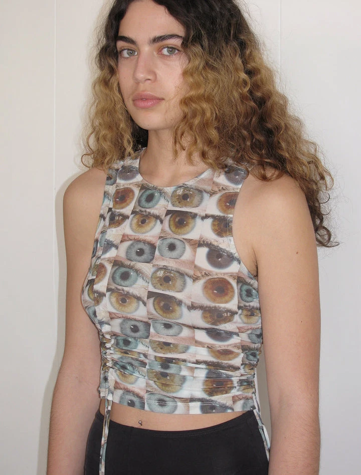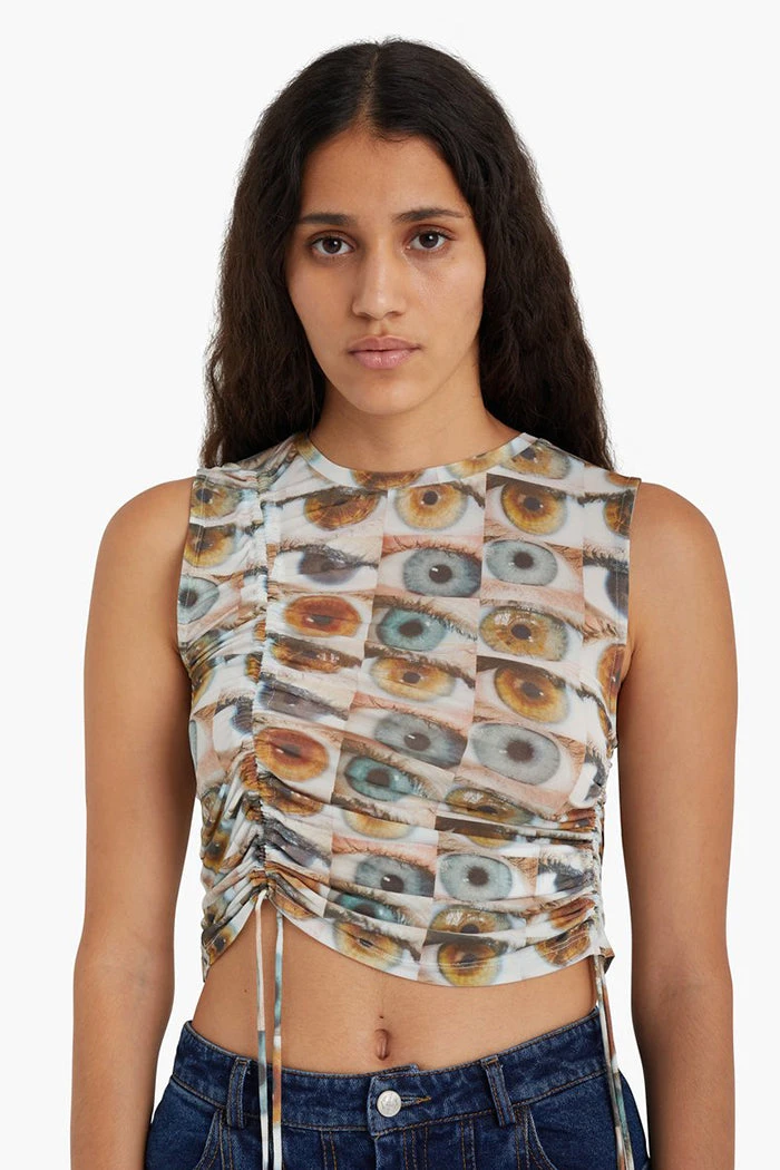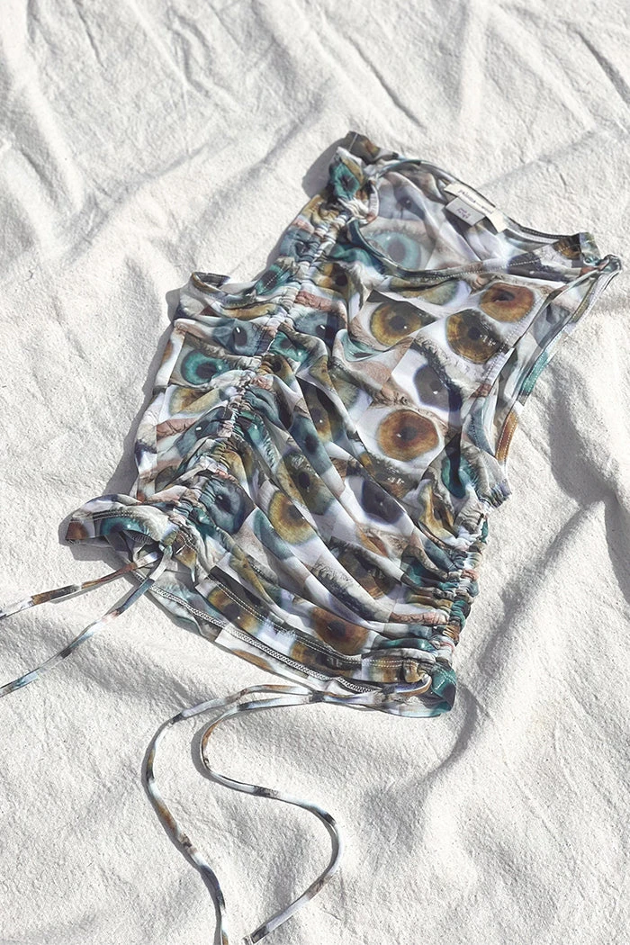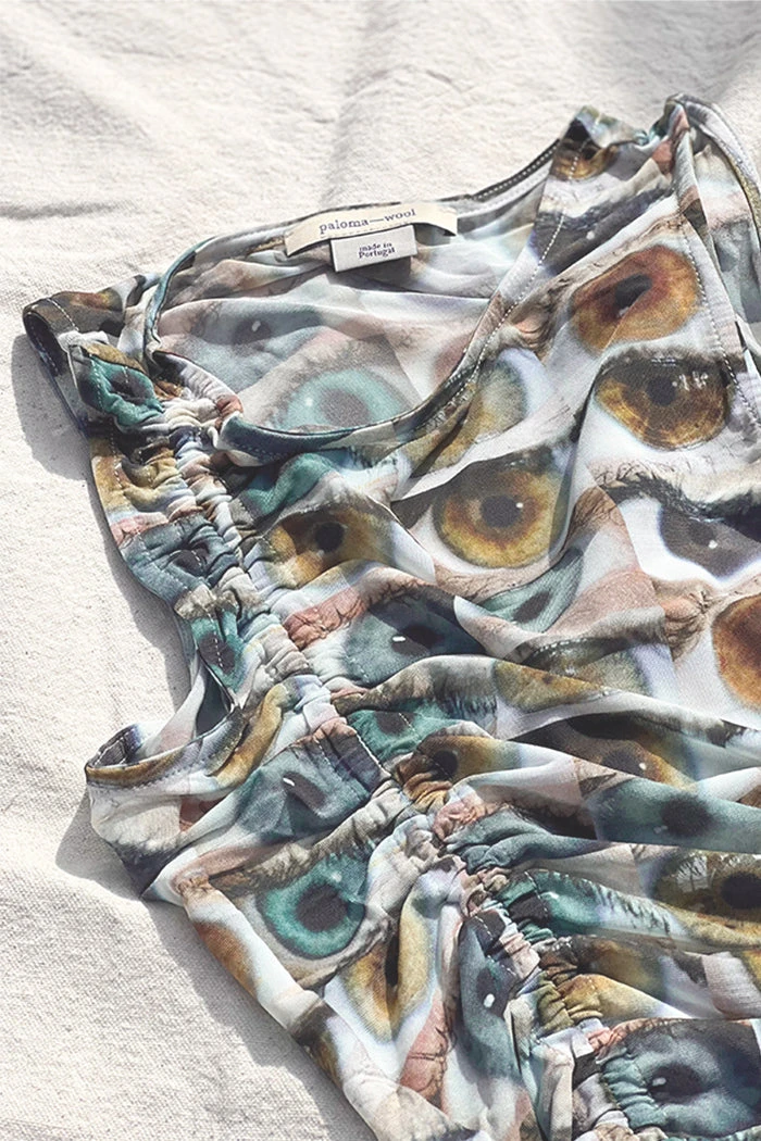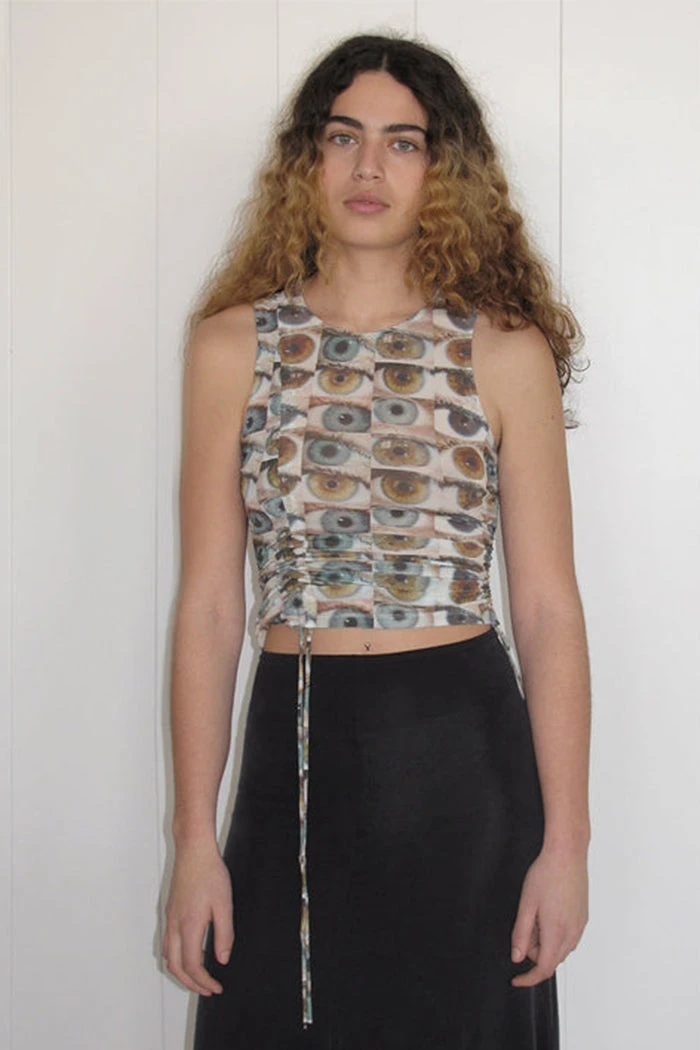 Paloma Wool Baviera sleeveless tank top with adjustable asymmetric drawstrings in ecru. Fabric is soft, fine and slightly sheer.Â