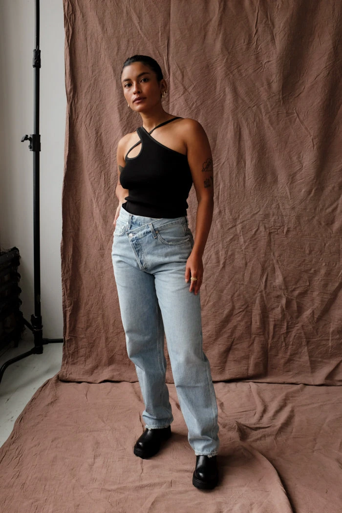 Cassie asymmetric criss cross ribbed knitted tank top in black.
