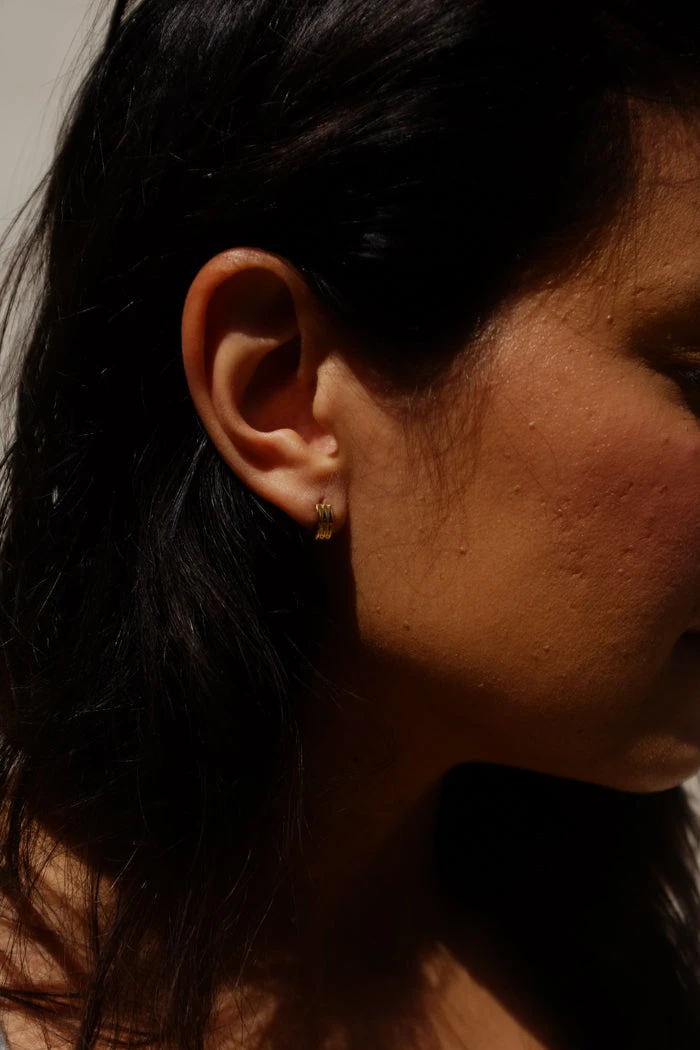 Claire huggies mini gold hoop earrings with 2 lined grooves.