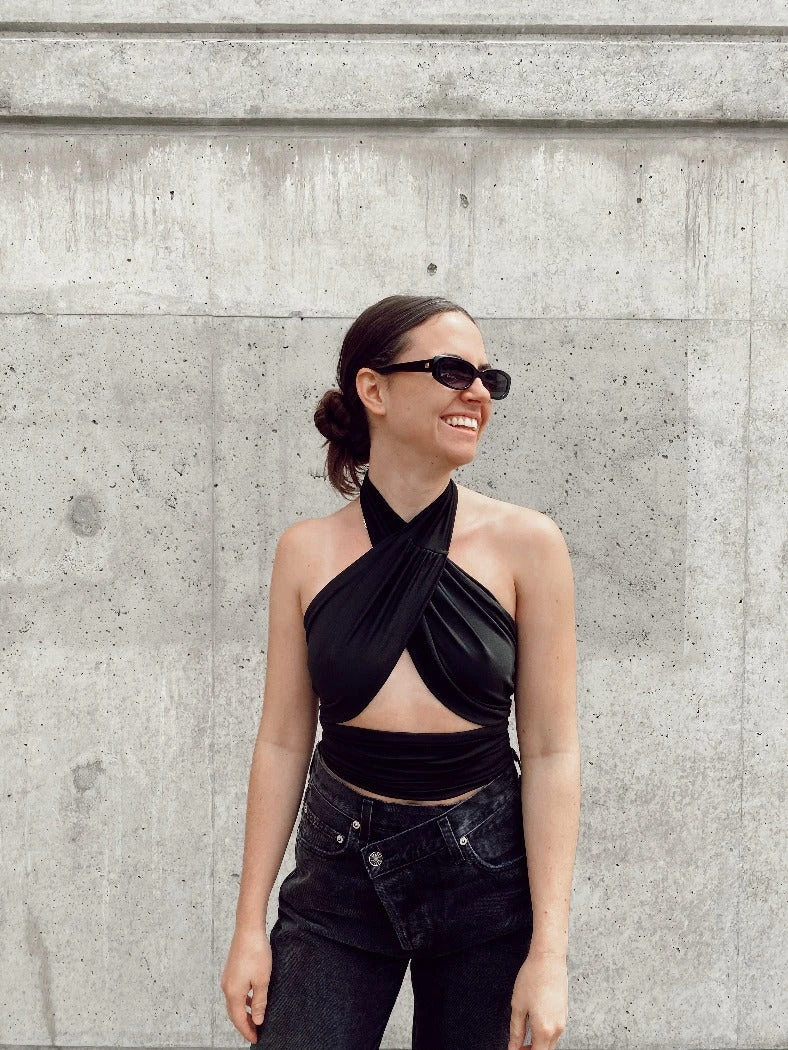 Monica wrap tank top in black. This tank top can be wrapped in an unlimited number of ways!