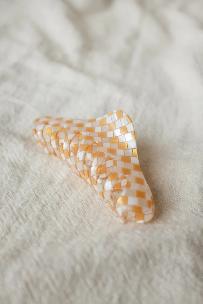 Large shell shape checkered hair claw in checkered peach.