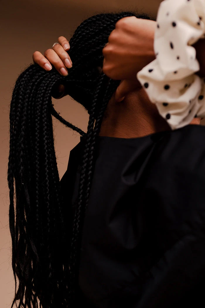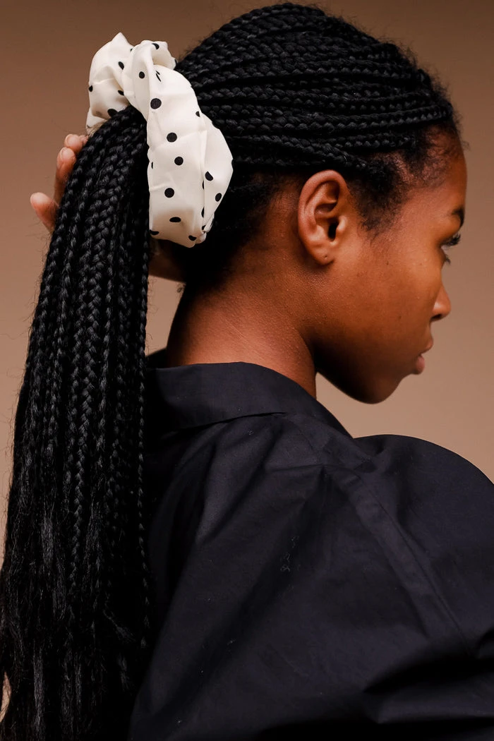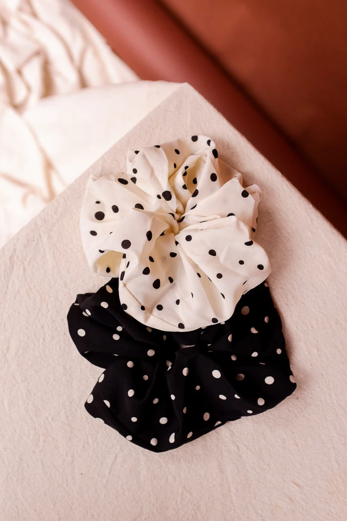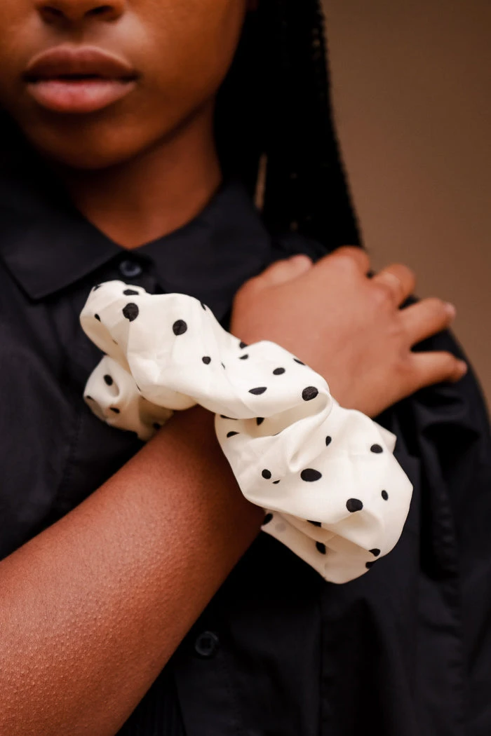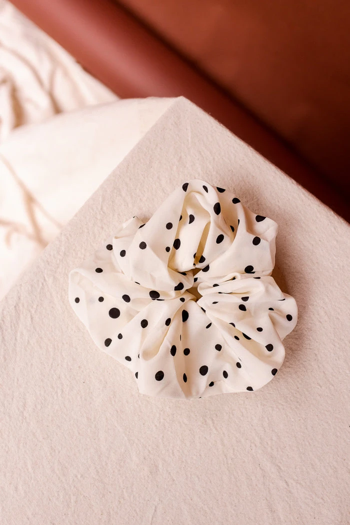 Silky oversized silky ivory satin scrunchy with black polka dots.