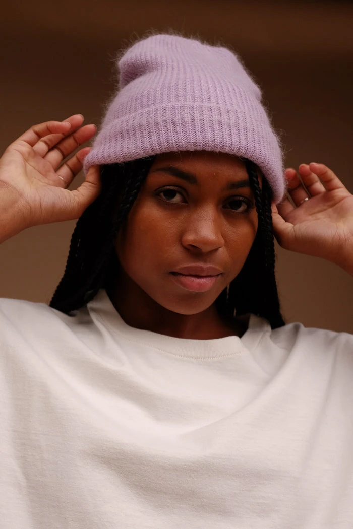 Smith knit lilac purple beanie is the perfect fuzzy beanie for the winter.