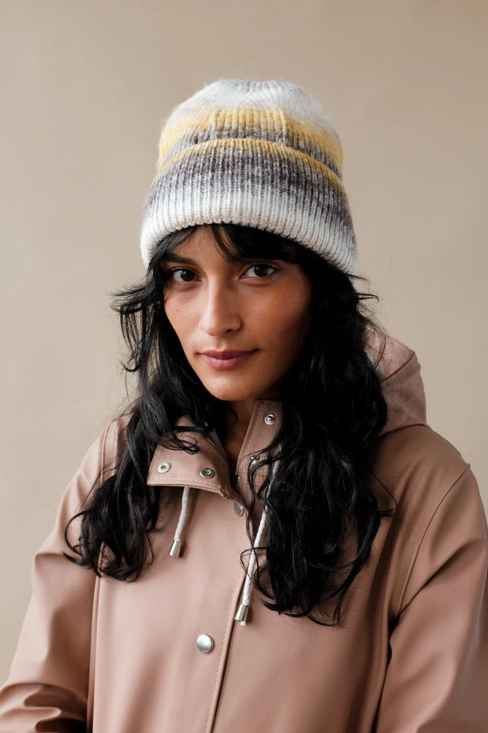 Soft knit mustard, white, tan ombre Sunset beanie.
