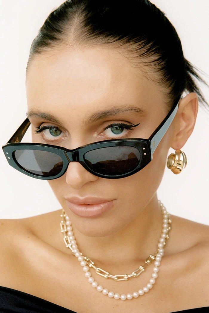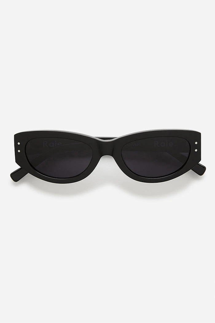 Raie Lakota Sunglasses in black. The unisex oval frame is one of the most modern and durable frames, each pair has signature metal detailing outside the lenses, making him your go to for the street.