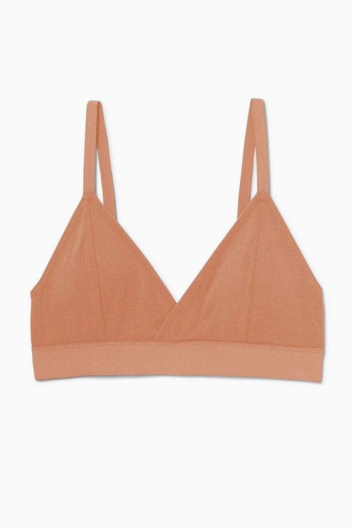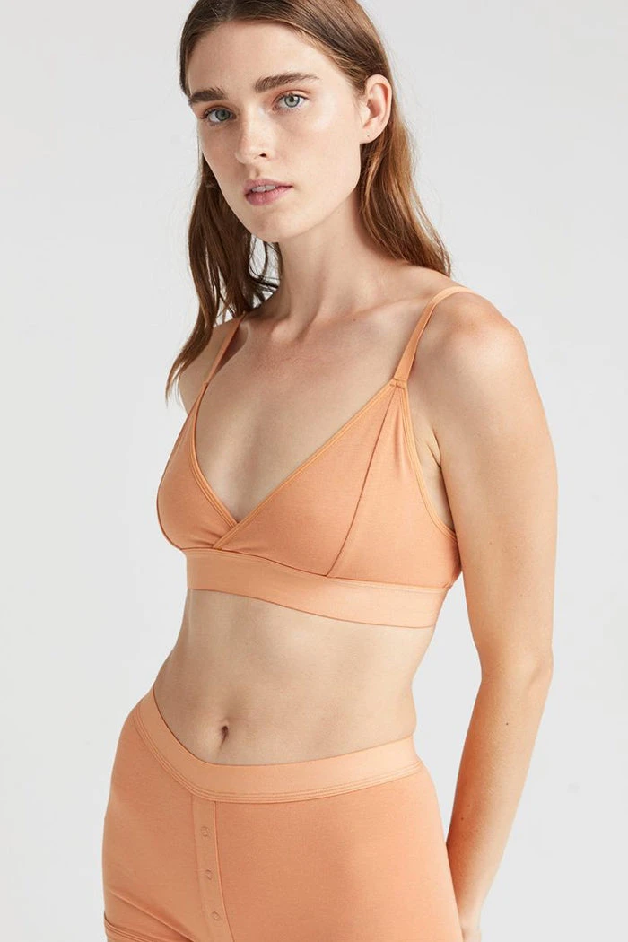 Richer Poorer classic bralette in clay. Minimal coverage, pullover style with wide elastic band. Separate Triangle cups, with darts, unpadded and unstructured. Ultra-soft modal cotton blend. Shrink resistant. Adjustable straps.