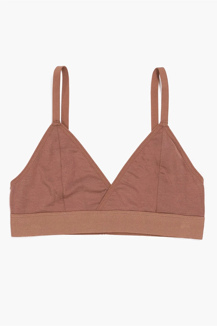 Richer Poorer classic bralette in latte. Minimal coverage, pullover style with wide elastic band.. Separate Triangle cups, with darts, unpadded and unstructured. Ultra-soft modal cotton blend. Shrink resistant. Adjustable straps.