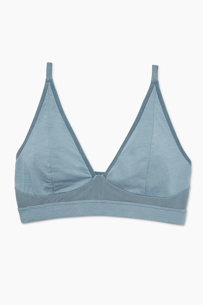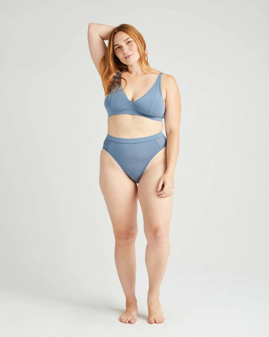 Richer Poorer high cut bralette in blue mirage. Modest coverage, pullover style with covered elastic band, separate high apex cups, power mesh detail and adjustable straps.