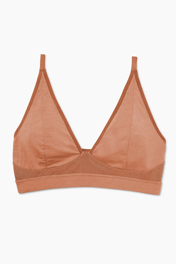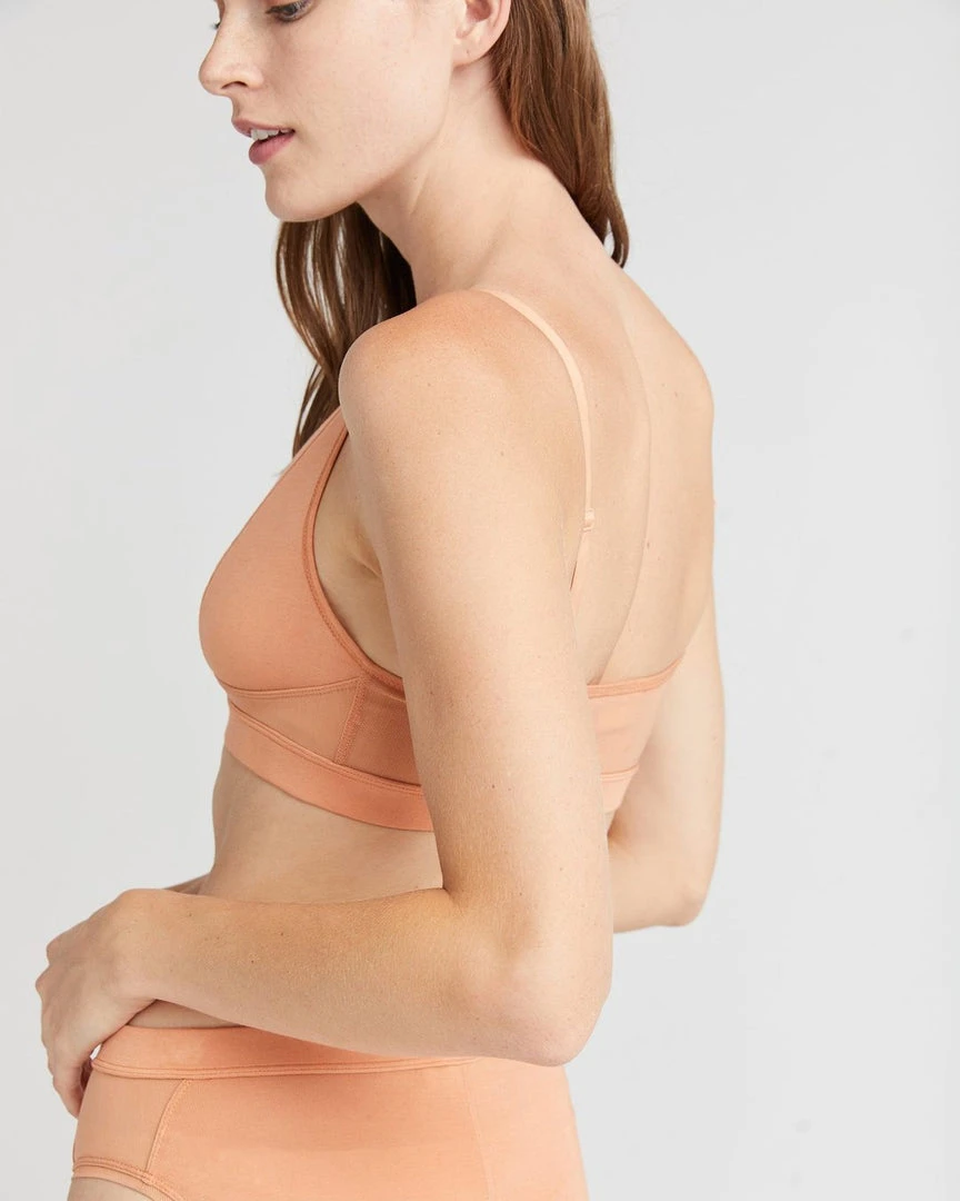Richer Poorer high cut bralette in clay orange. Modest coverage, pullover style with covered elastic band, separate high apex cups, power mesh detail and adjustable straps.