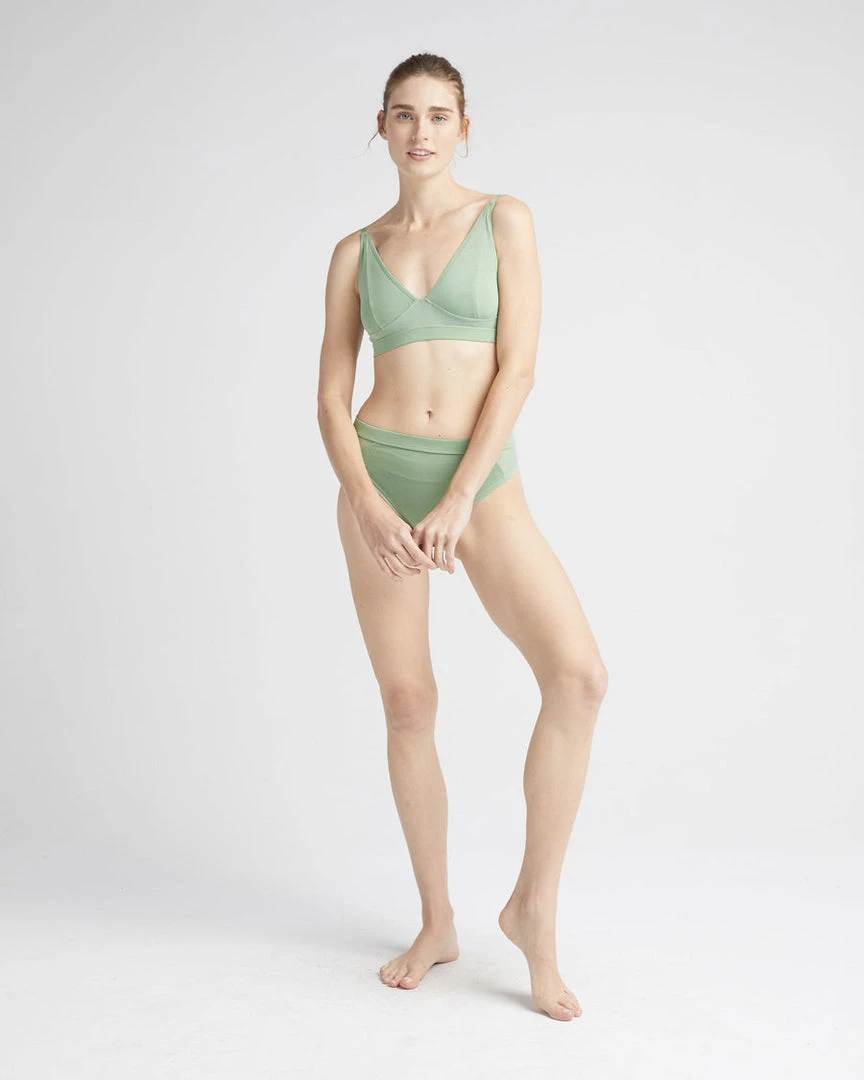 Richer Poorer high cut bralette in sage green. Modest coverage, pullover style with covered elastic band, separate high apex cups, power mesh detail and adjustable straps.