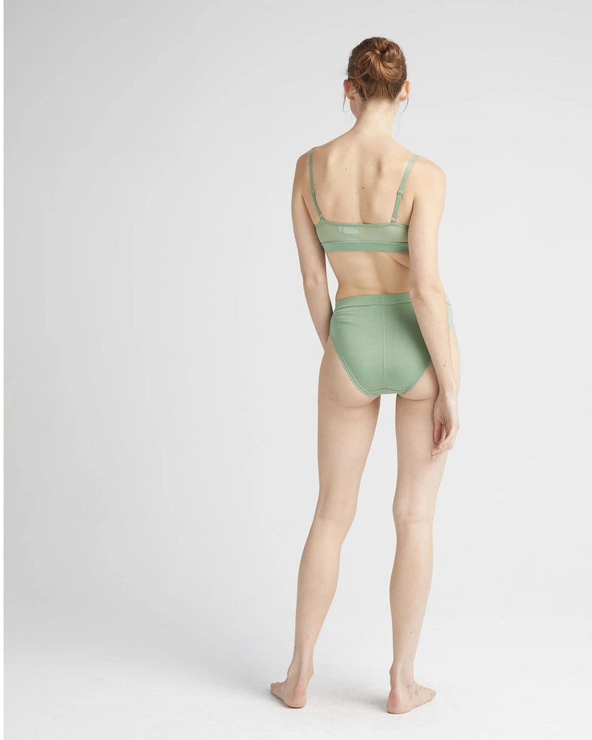 Richer Poorer high cut brief underwear in ivory sage. Minimal coverage, high waist, covered elastic waistband, power mech insets at sides, and high cut leg openings.Â
