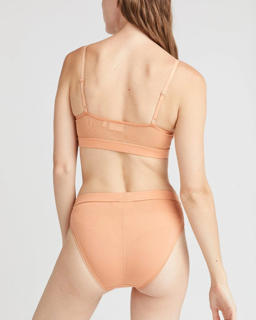 Richer Poorer high cut brief underwear in clay. Minimal coverage, high waist, covered elastic waistband, power mech insets at sides, and high cut leg openings.