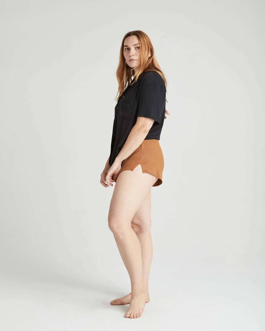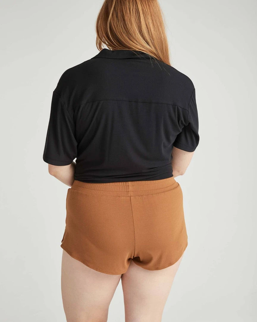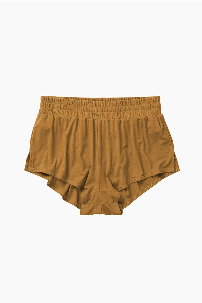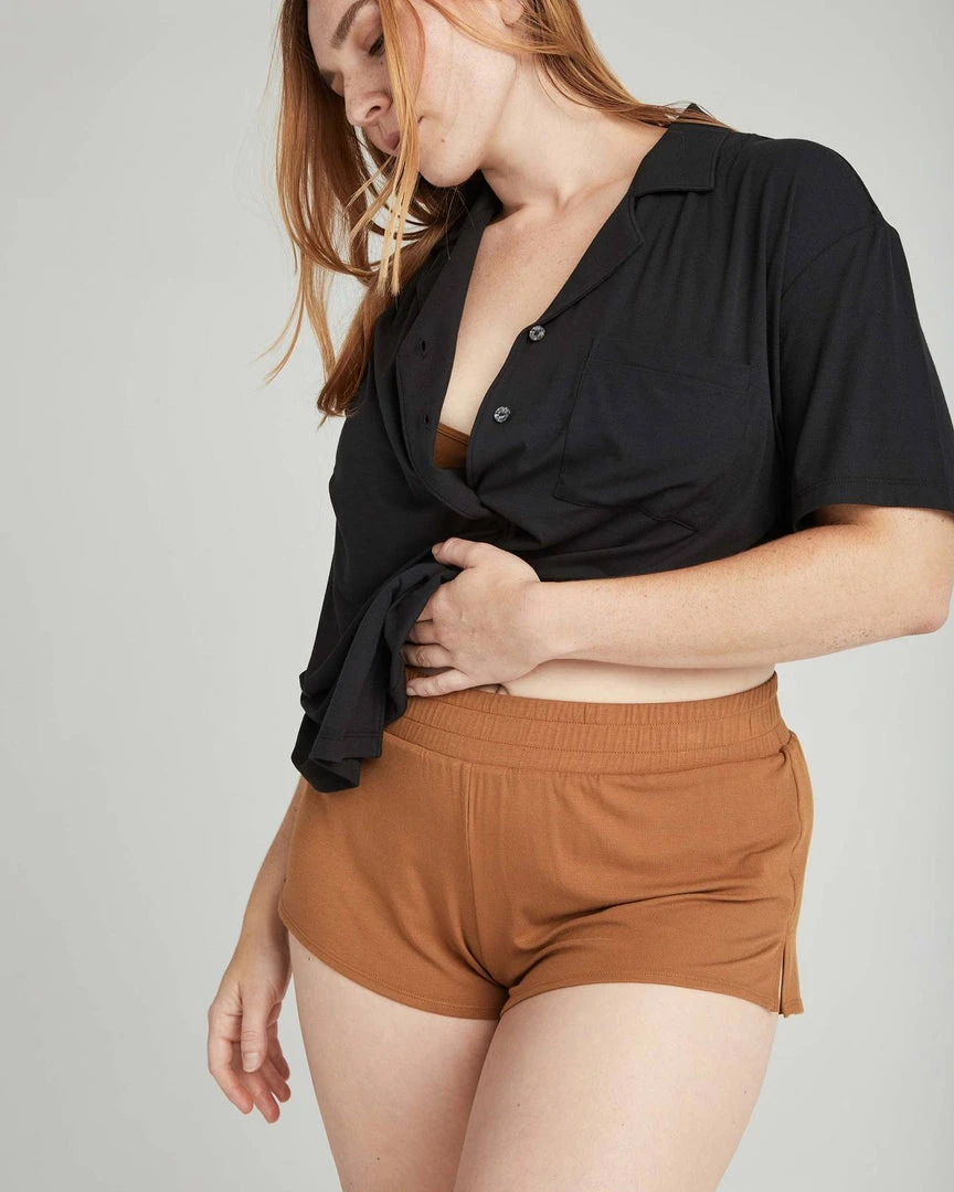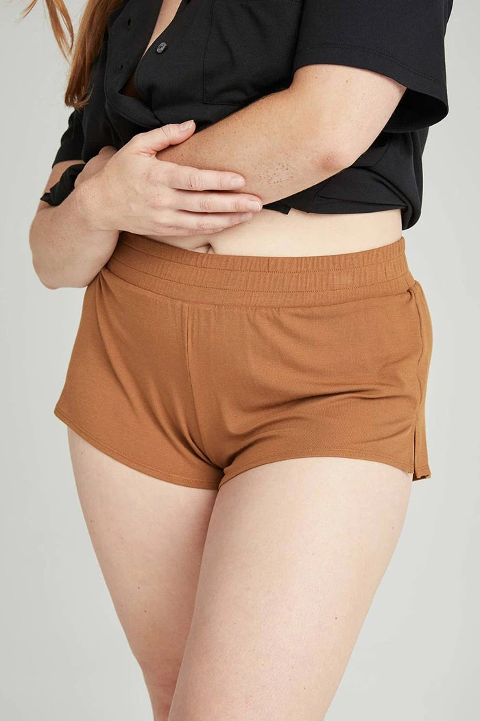 Richer Poorer night sleep shorts in woodgrain brown. Built in brief underwear, covered elastic waistband, and side slit outseams.
