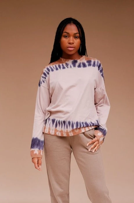 Richer Poorer Unisex Relaxed Long Sleeve Pullover Tee in tie dye. Men’s style relaxed fit, pigment dyed, dropped shoulder seams, novelty sweater rib detail and novelty stitching detail.