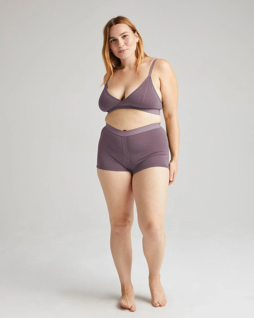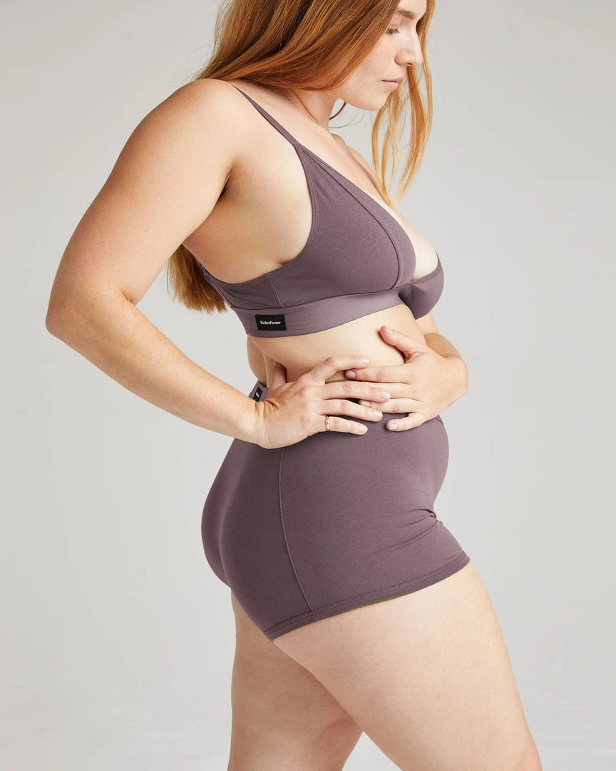 Richer Poorer plum smoke boxer briefs. Soft elastic waistband, faux snap detail at front, ultra-soft modal cotton blend, shrink resistant.