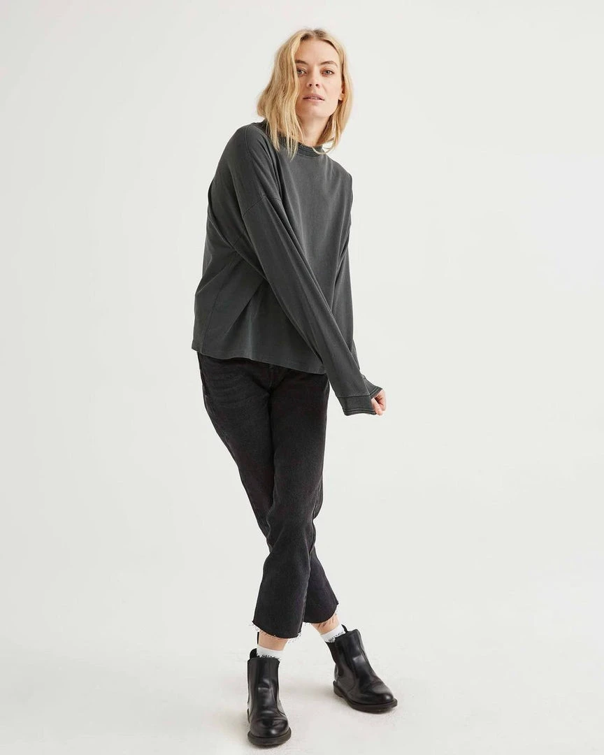 Richer Poorer relaxed thick long sleeve pullover. Pigment dyed, dropped shoulder seam, novelty sweater rib detail and novelty stitching detail.