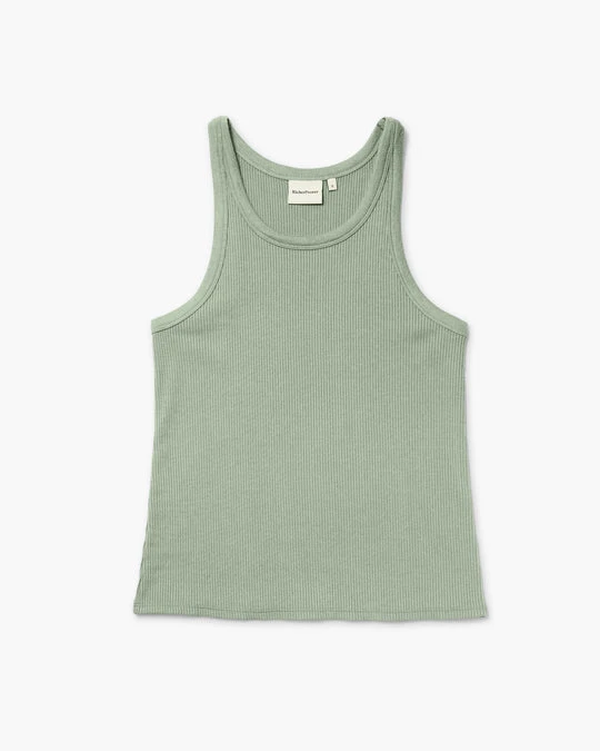 Richer Poorer vintage rib knit racer tank in sage green. Slim fit, made from sustainable lyocell, high neckline with slight racer front shape.Â