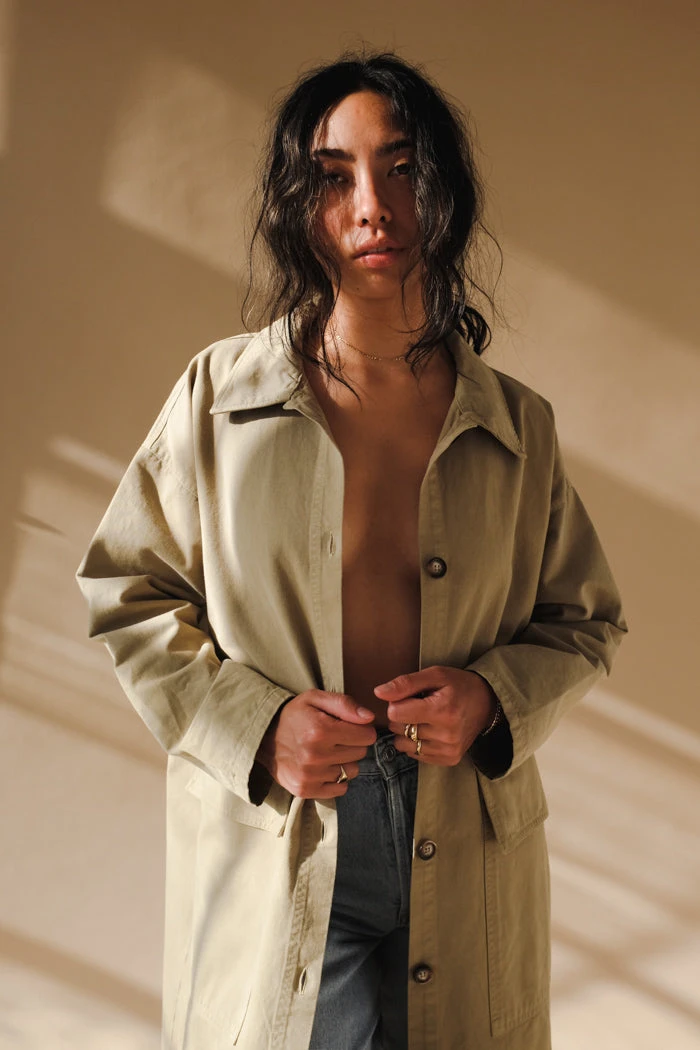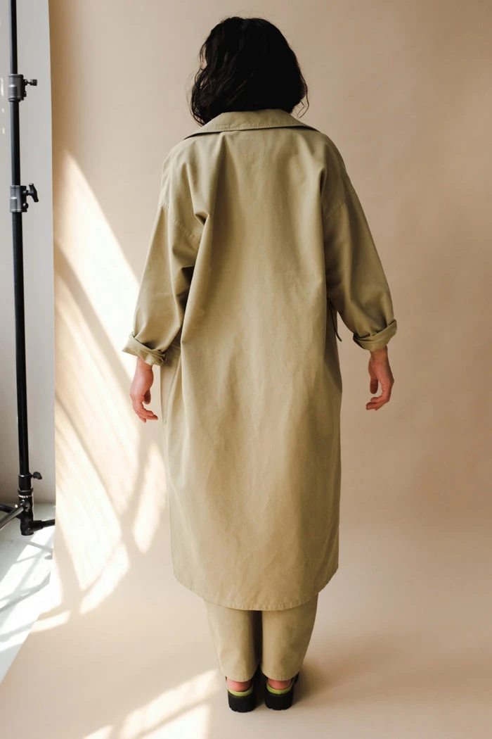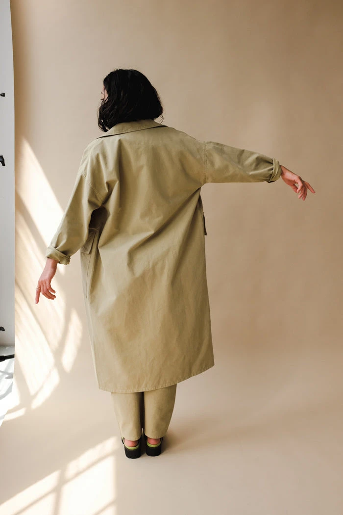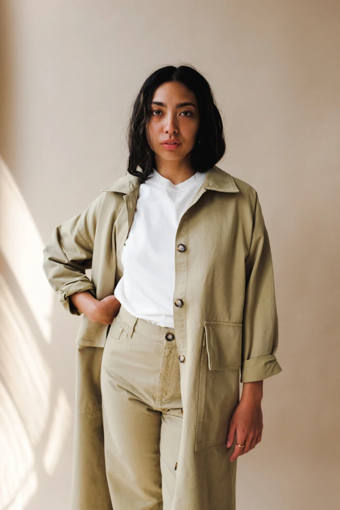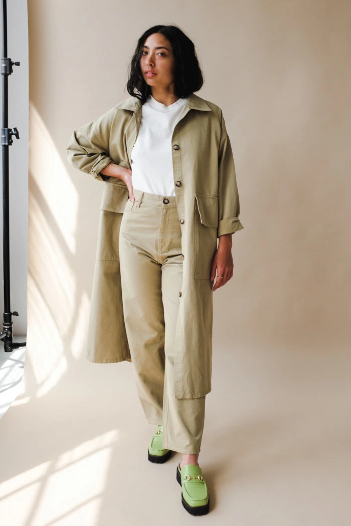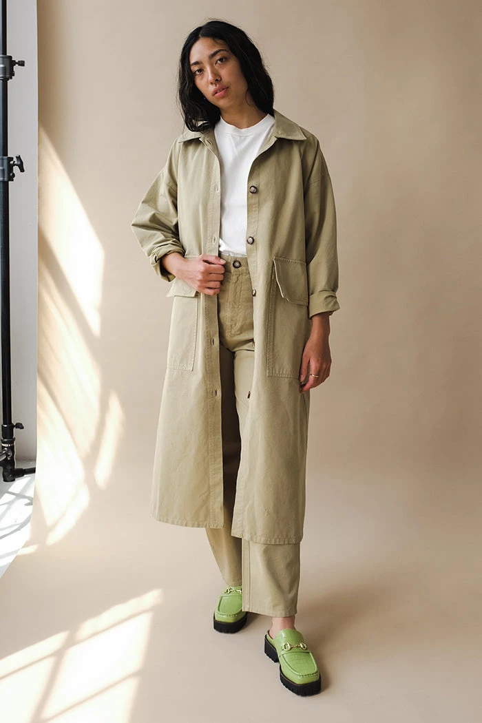 Rita Row long denim Adela denim jacket in light khaki green. Front flap pockets.