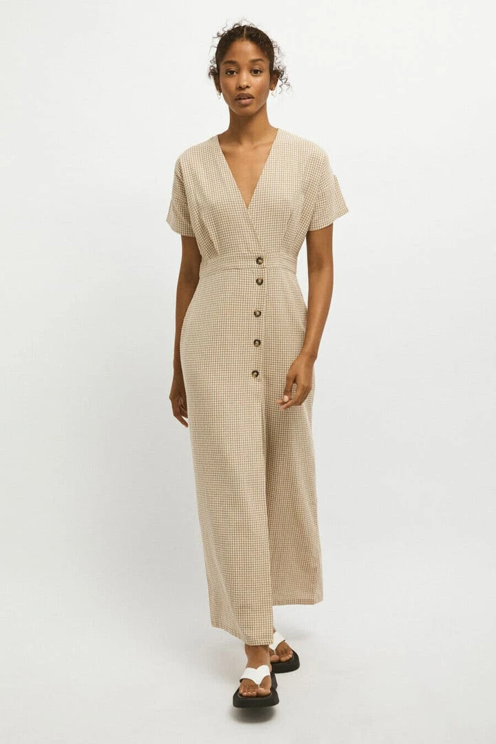 Rita Row Thais long dress with crossed neckline in sand gingham.