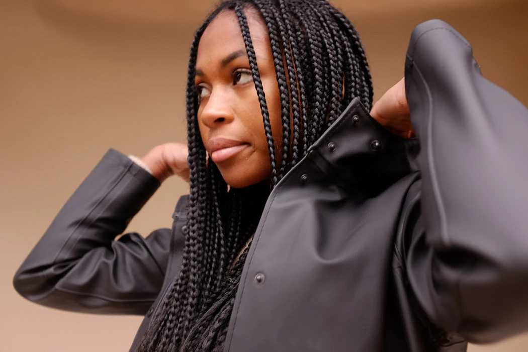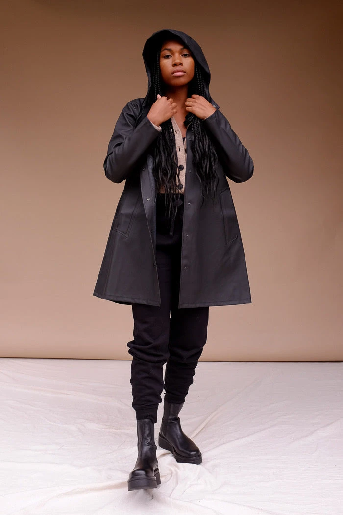 Stutterheim Mosebacke Black raincoat is the A-line version of Stutterheim’s iconic raincoat. This unisex model has a fashion forward silhouette, with a spacious cut. It is handmade in rubberized cotton, comes unlined and with welded seams. The finest craftsmanship is used to create this beautiful raincoat, here in black with black buttons, black cotton lining and hemp strings. See other colors in the Mosebacke here! Check out the straight Stockholm style here. Mosebacke