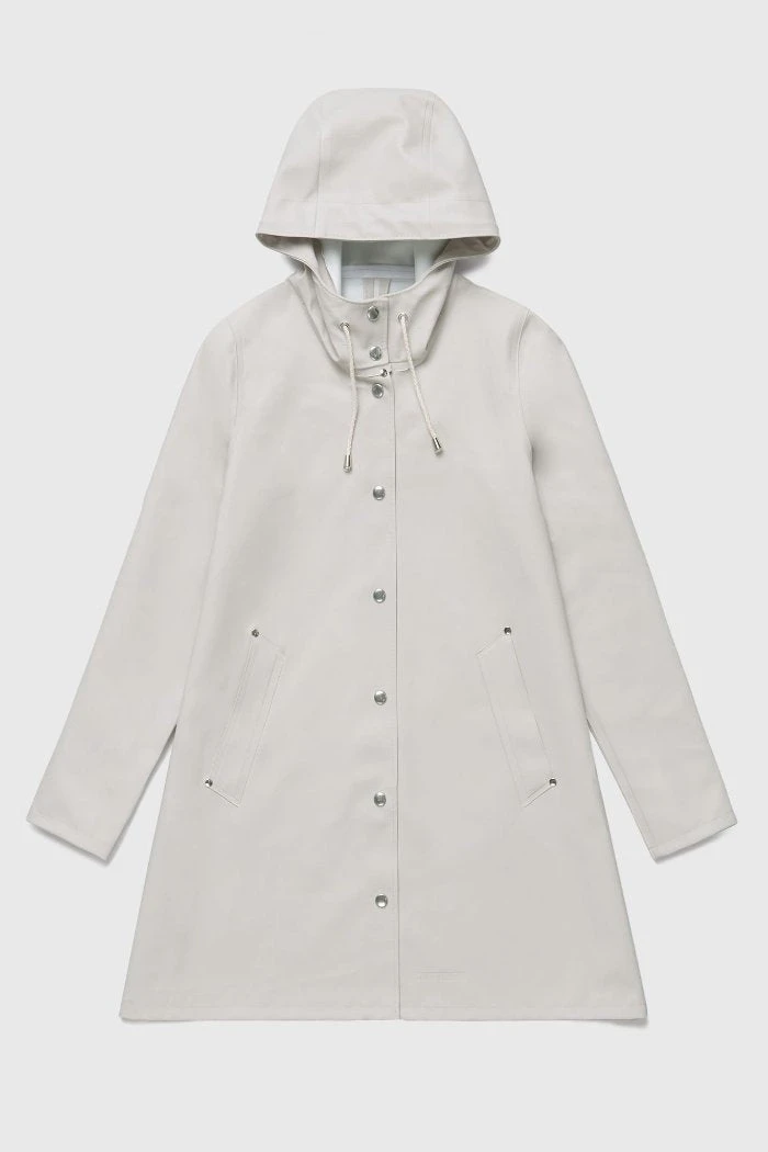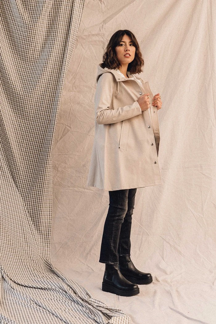 Stutterheim Mosebacke light sand raincoat is the A-line version of Stutterheim’s iconic raincoat. This unisex model has a fashion forward silhouette, with a spacious cut. It is handmade in rubberized cotton, comes unlined and with welded seams. The finest craftsmanship is used to create this beautiful raincoat, here in green with silver buttons and hemp strings. See other colors in the Mosebacke here!Check out the straight Stockholm style here. Mosebacke